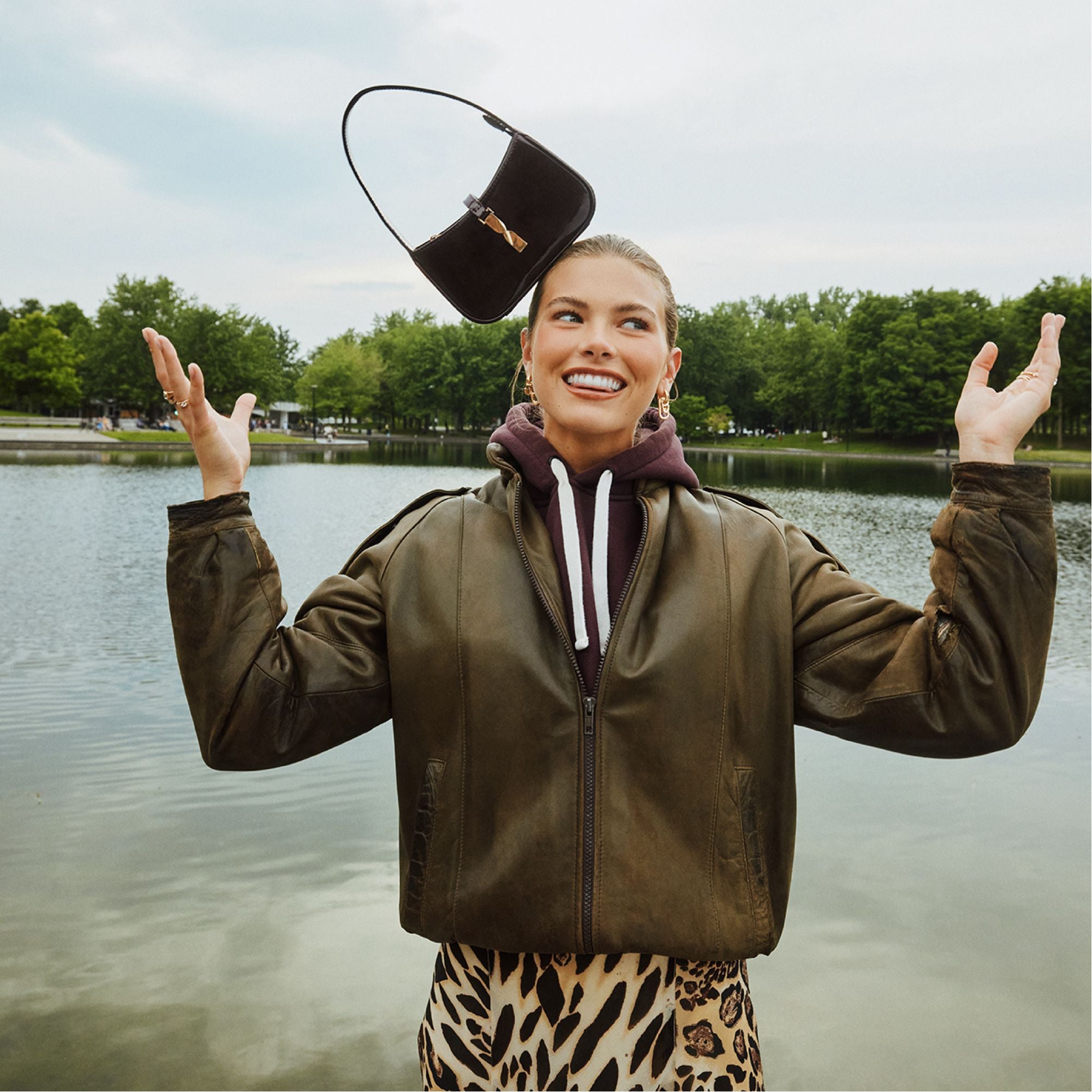 High-gloss espresso-dark patent leather coats a compact shoulder bag, delivering a ’90s silhouette with sculpted golden twist bars that snap magnetically shut over a clean, confident frame for city nights and rooftop chic. Carry it with satin slips for rooftop cocktails, or sling it over denim at galleries to finish the look with quiet confidence.