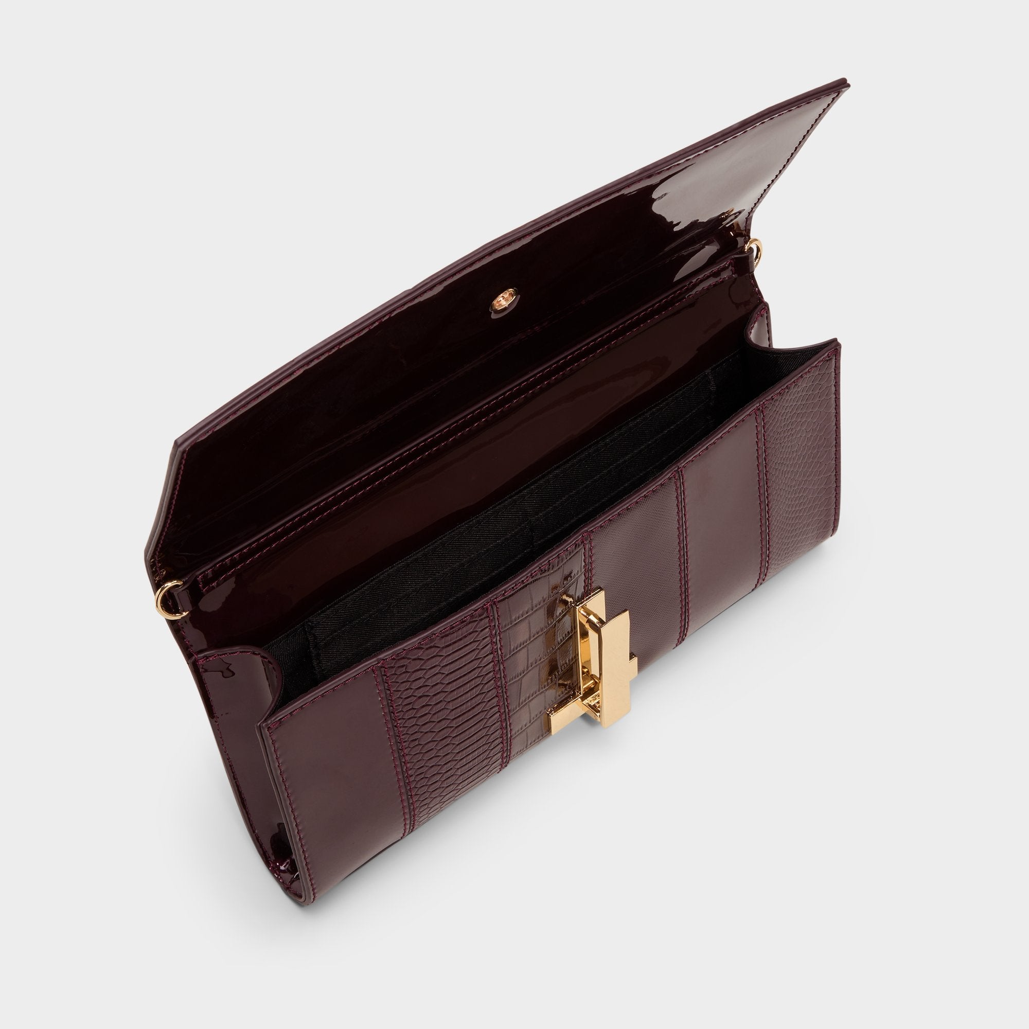 Glossy wine-tone patent leather combines croc, lizard, and smooth panels into a sleek patchwork finished with a minimalist gold bar clasp, creating a clutch that catches gallery lights and camera flashes. Clutch it against a satin slip for rooftop cocktails or tuck it under a tailored jumpsuit at wedding receptions to complete any look.