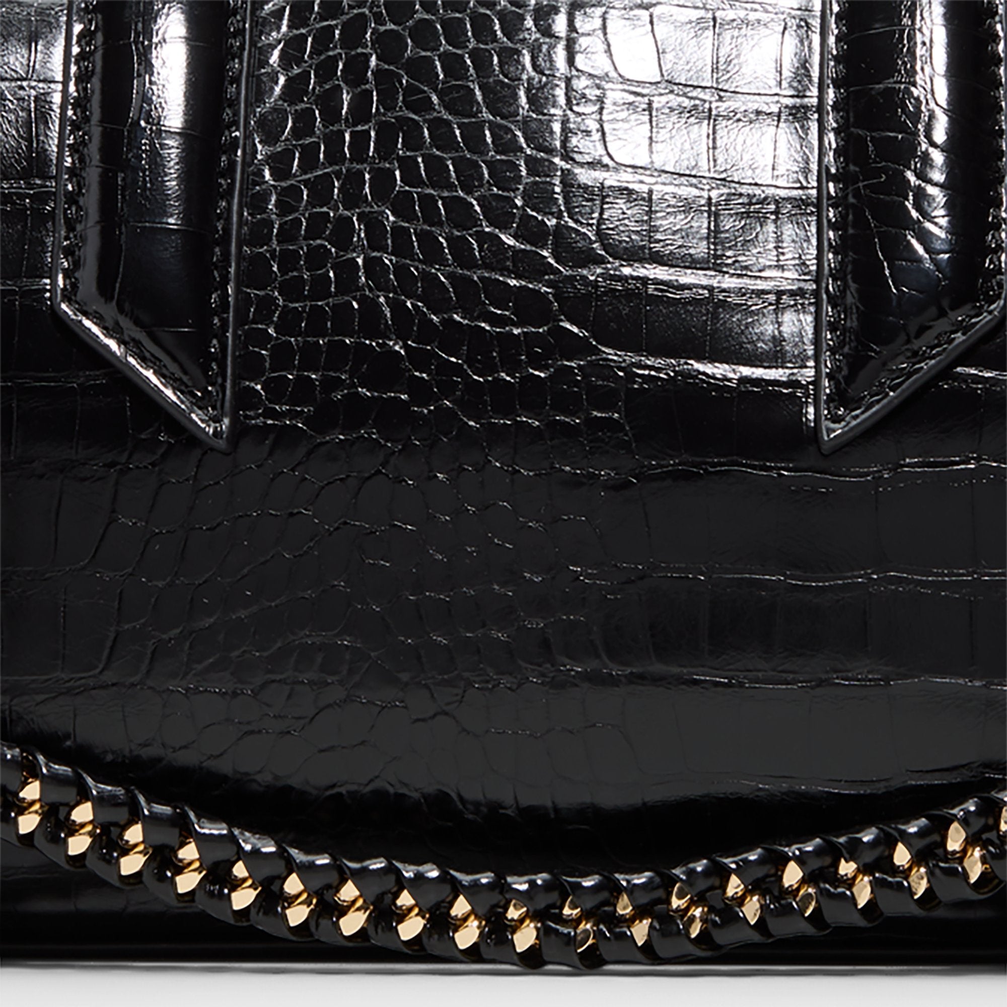 Glossy croc texture gives this barrel satchel after-dark edge, paired with an interchangeable chunky gold chain strap that shifts from cross-body to top-handle with effortless ease, ideal for city nights and late-day meetings, delivering versatile polish. Carry it with tailored blazers for pitches or sling it over satin slips at parties.