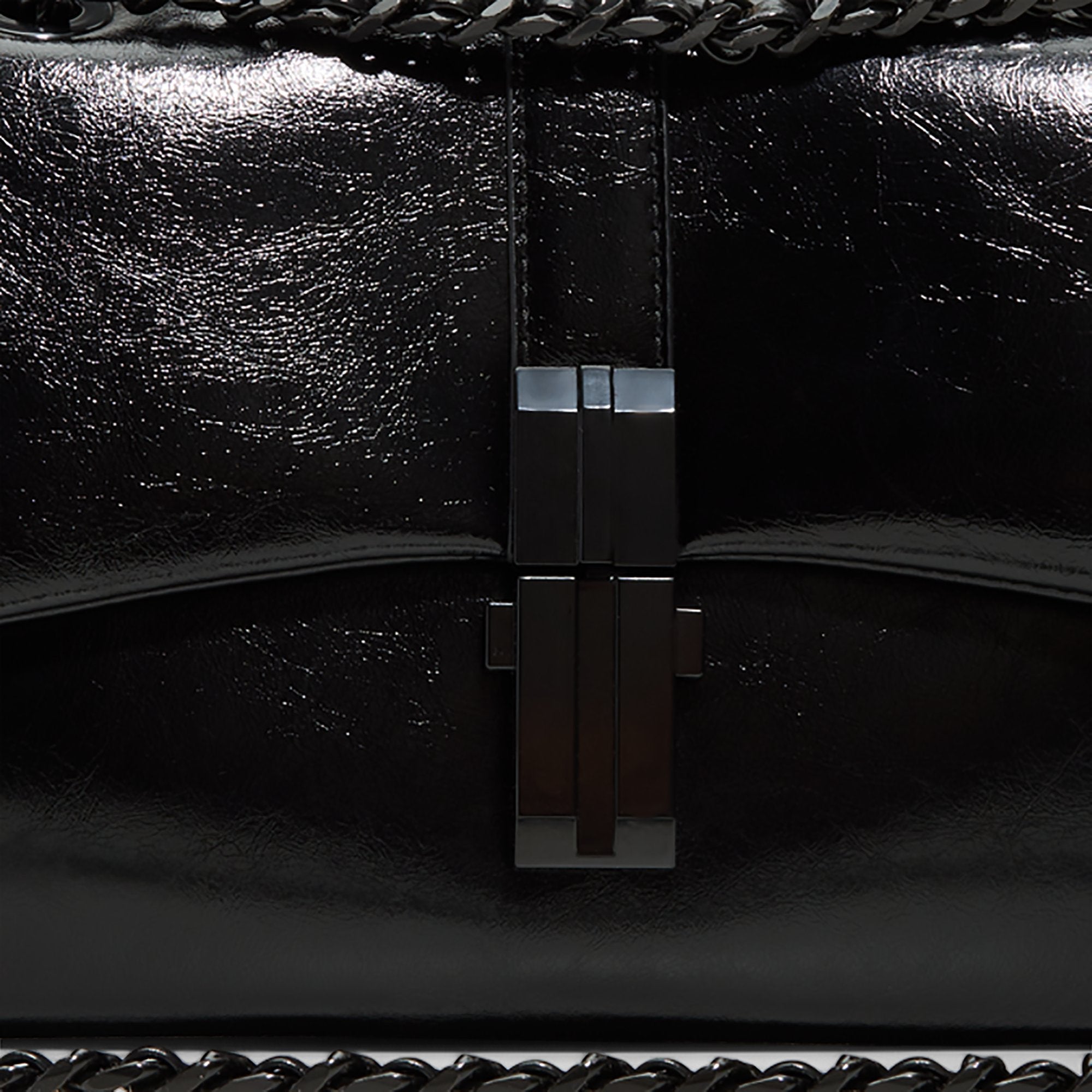 Midnight-gloss patent leather catches the city lights with a sculpted bar clasp anchoring a sleek compact flap, while a tonal chain strap keeps everything in line for after-hours confidence, and a whisper of refinement. Tuck it under a satin blazer for rooftop dates, or sling it cross-body with ripped denim for late-night gigs.