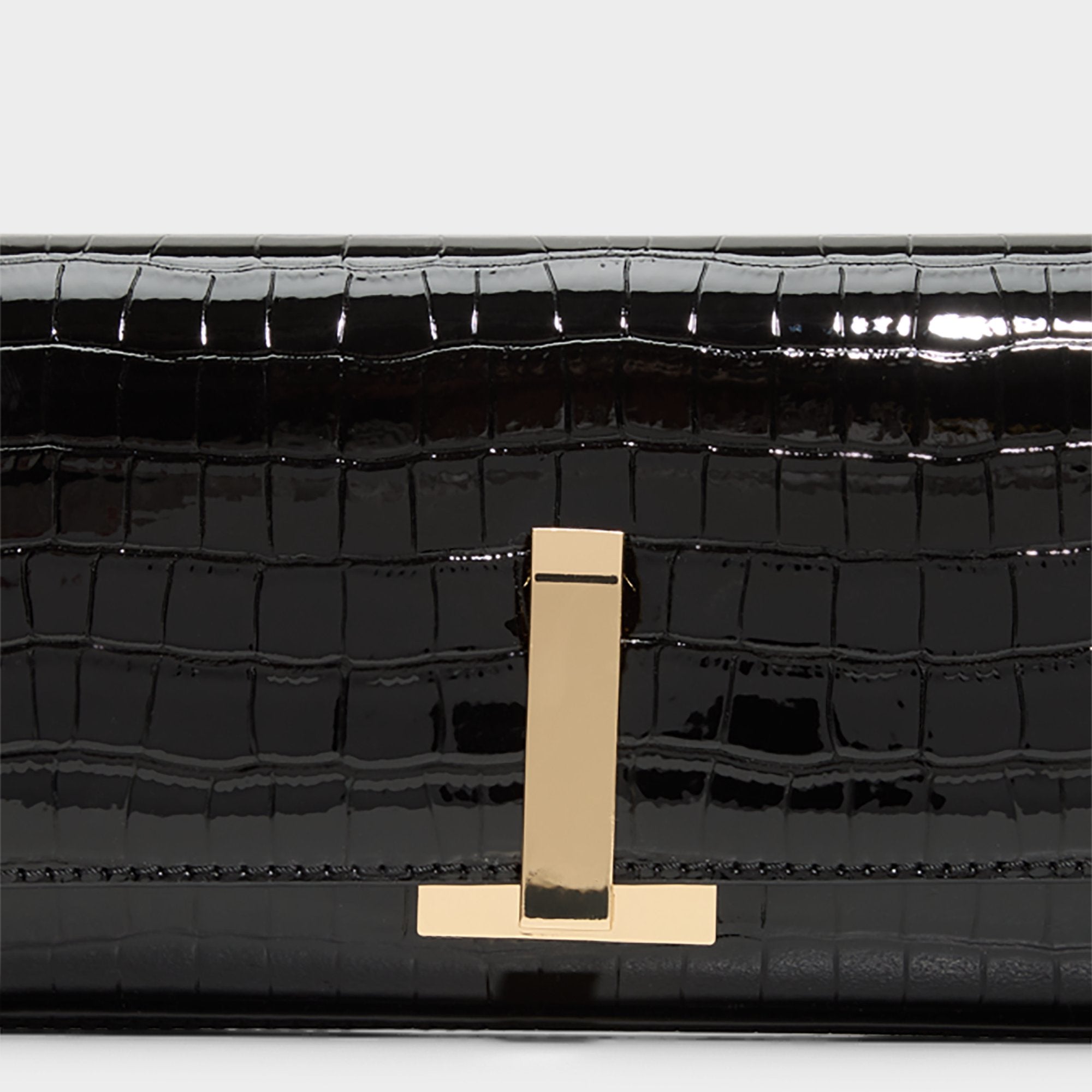 Glossy croc-embossed patent wraps a tube clutch, while a sculptural T-bar closure snaps shut with a satisfying click, spotlighting a chic lip-gloss moment beneath satin slips and elevating every formal moment. Carry it to formal dinners or pair with high-waist trousers for rooftop soirées, finishing looks with a confident, glossy polish.