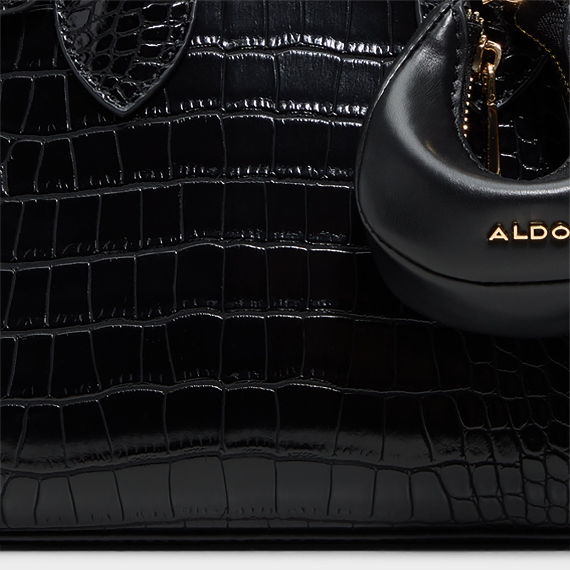Croc-embossed lines meet clean architectural edges on this tote, while a sculptural mini bag charm swings from gold hardware, offering quick space for earbuds and a secure snap closure that keeps essentials neatly at hand. Carry it with a tailored blazer for client catch-ups or over a slip dress for downtown dinners, finishing looks with effortless polish.