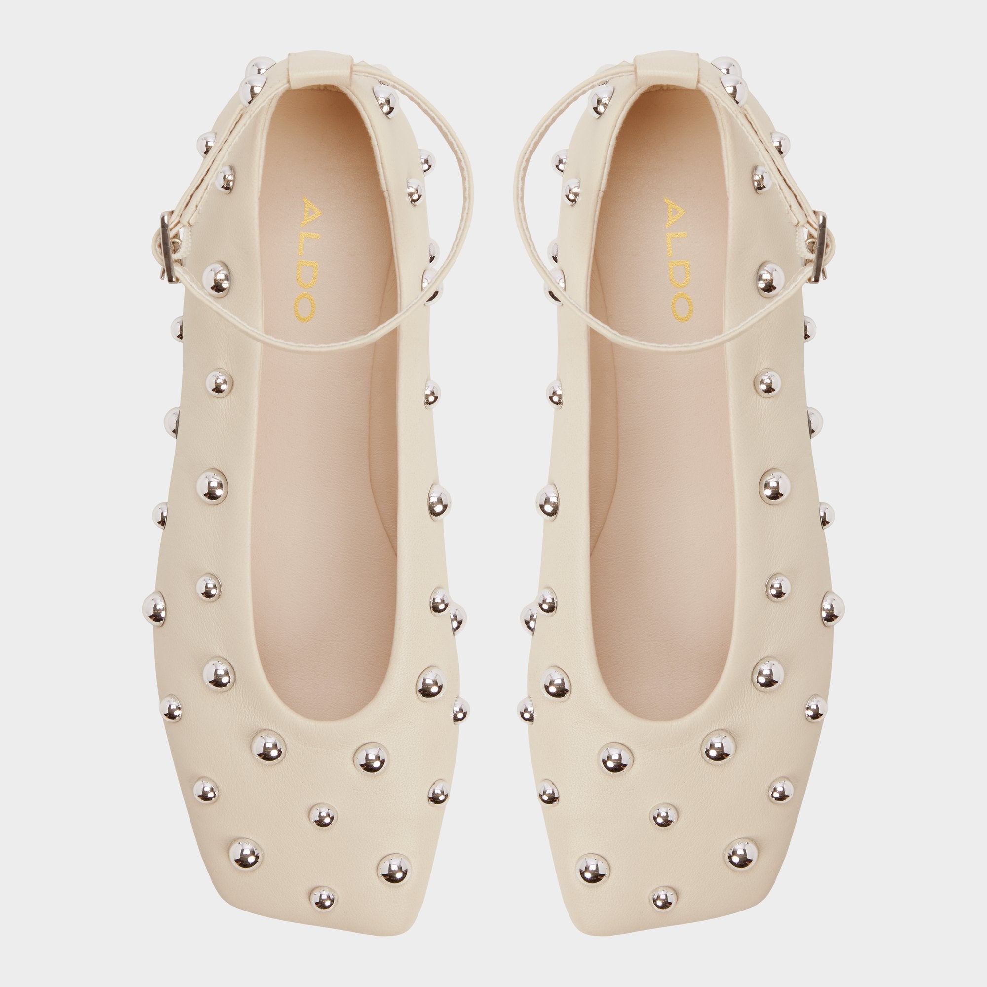 Silver-tone studs gleam across buttery leather, turning this sleek flat into a city-night moment, while an adjustable ankle strap keeps each step secure on a flexible rubber sole designed for all-day city sprints. Pair with cropped denim for catch-ups, or anchor a satin slip for rooftop celebrations.