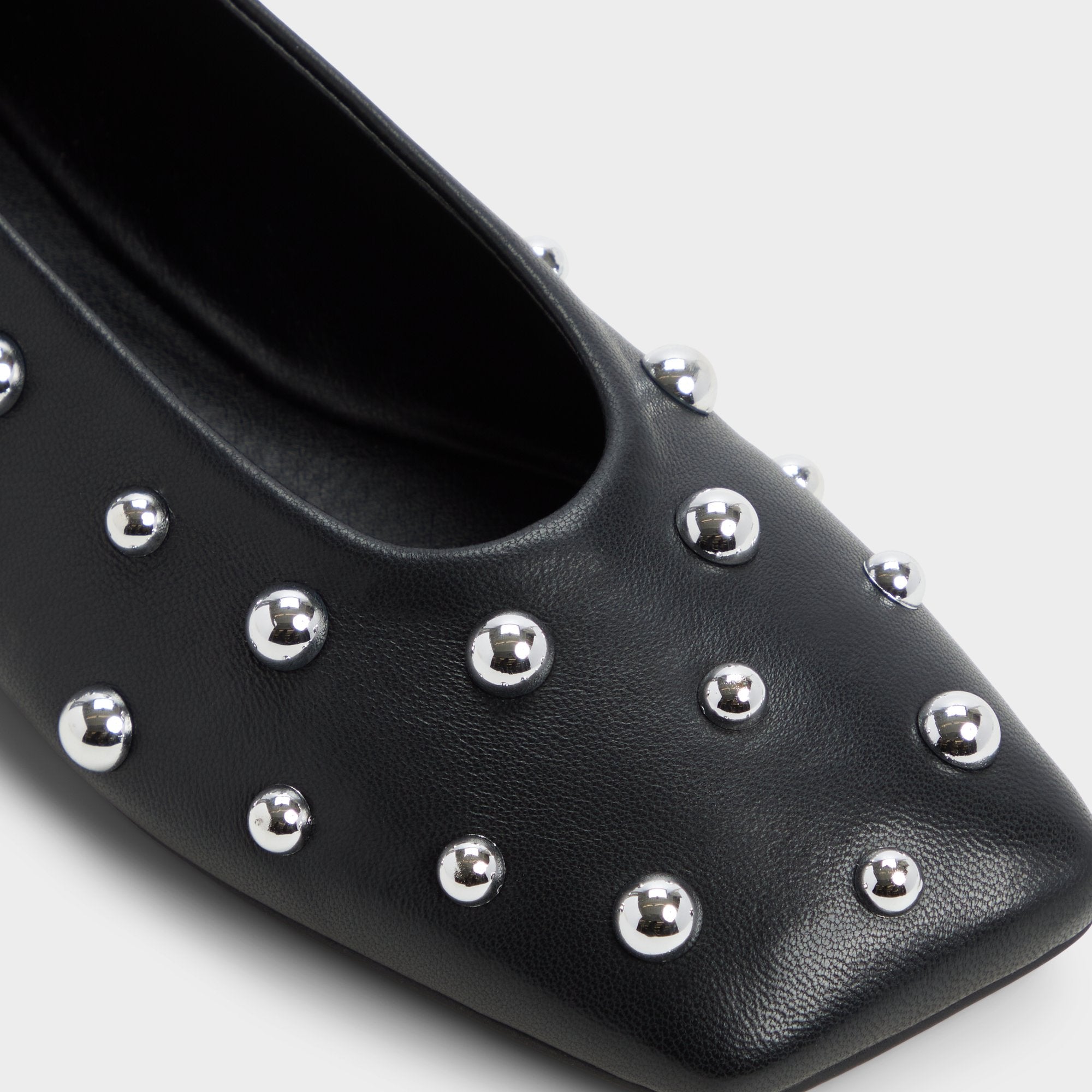 Polished metal studs crown this ankle-strap ballet flat, a sleek counterpoint to smooth black leather, giving an edge that reads rebellious yet polished for days that flow from desk to dinner. Pair with cropped tailored trousers for office brainstorms, or slip under a dress when gigs call.