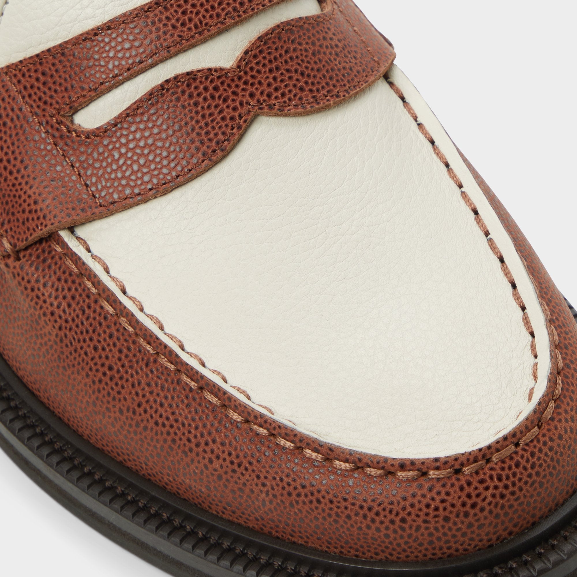 Cream-topped vamp meets brown leather, giving penny loafers a fresh spin on a classic style with subtle texture, easy steps, and wearable polish for daily moments. Team them with cropped navy chinos for art openings, or pair with raw denim for patio drinks after sunset, adding versatile charm to any city errand or evening hang.