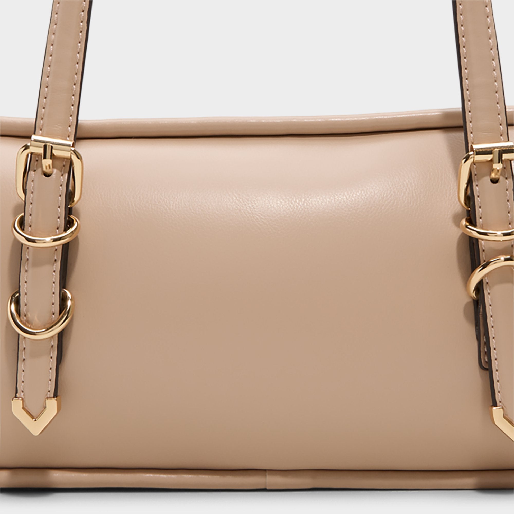 Smooth as latte foam, this slim rectangular shoulder bag taps into Y2K nostalgia with buckle-trimmed straps and buttery beige leather, holding essentials behind its neat zip top. Tuck it under a blazer for coffee outings or pair it with a slip dress and heels on date nights to complete the ensemble.