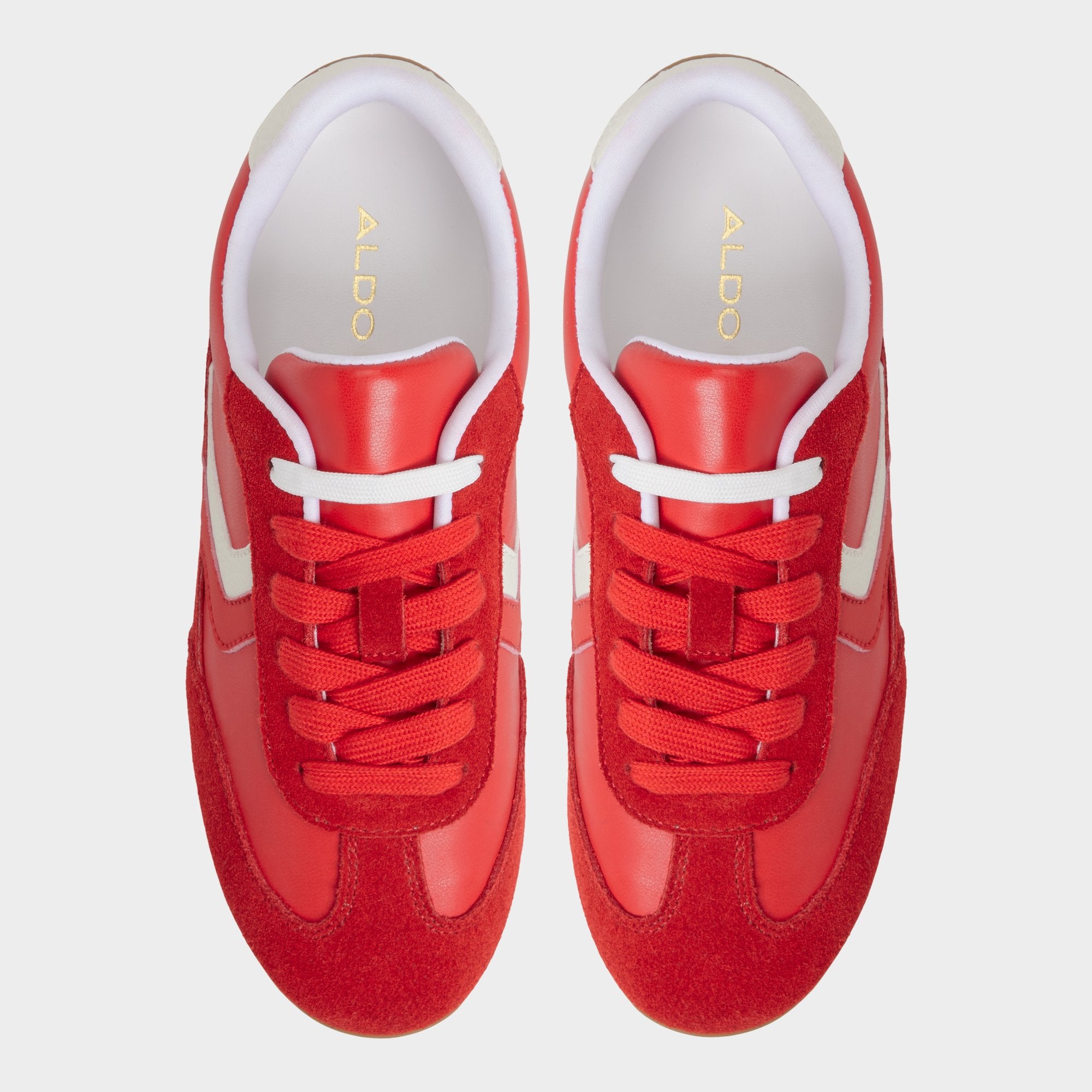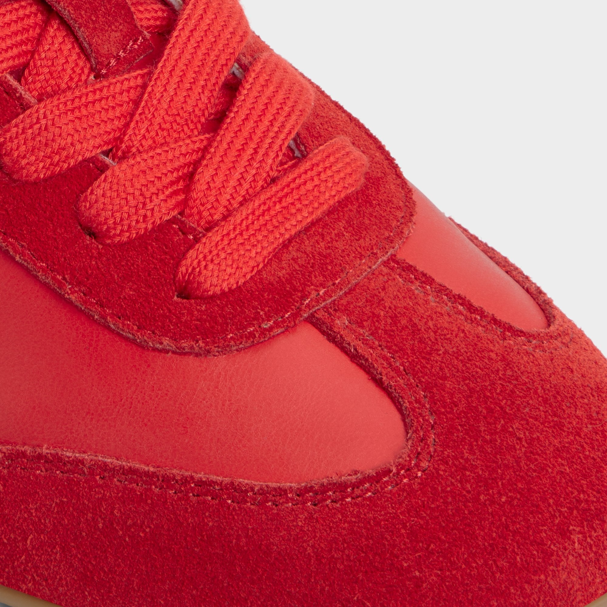Punchy scarlet suede collides with sporty fabric panels as a crisp chevron stripe flashes across the side on top of a cushioned cupsole that softens every errand sprint and playlist-powered detour. Pair with bike shorts for coffee commutes or swap in wide-leg trousers when after-work hangs call for laid-back polish.