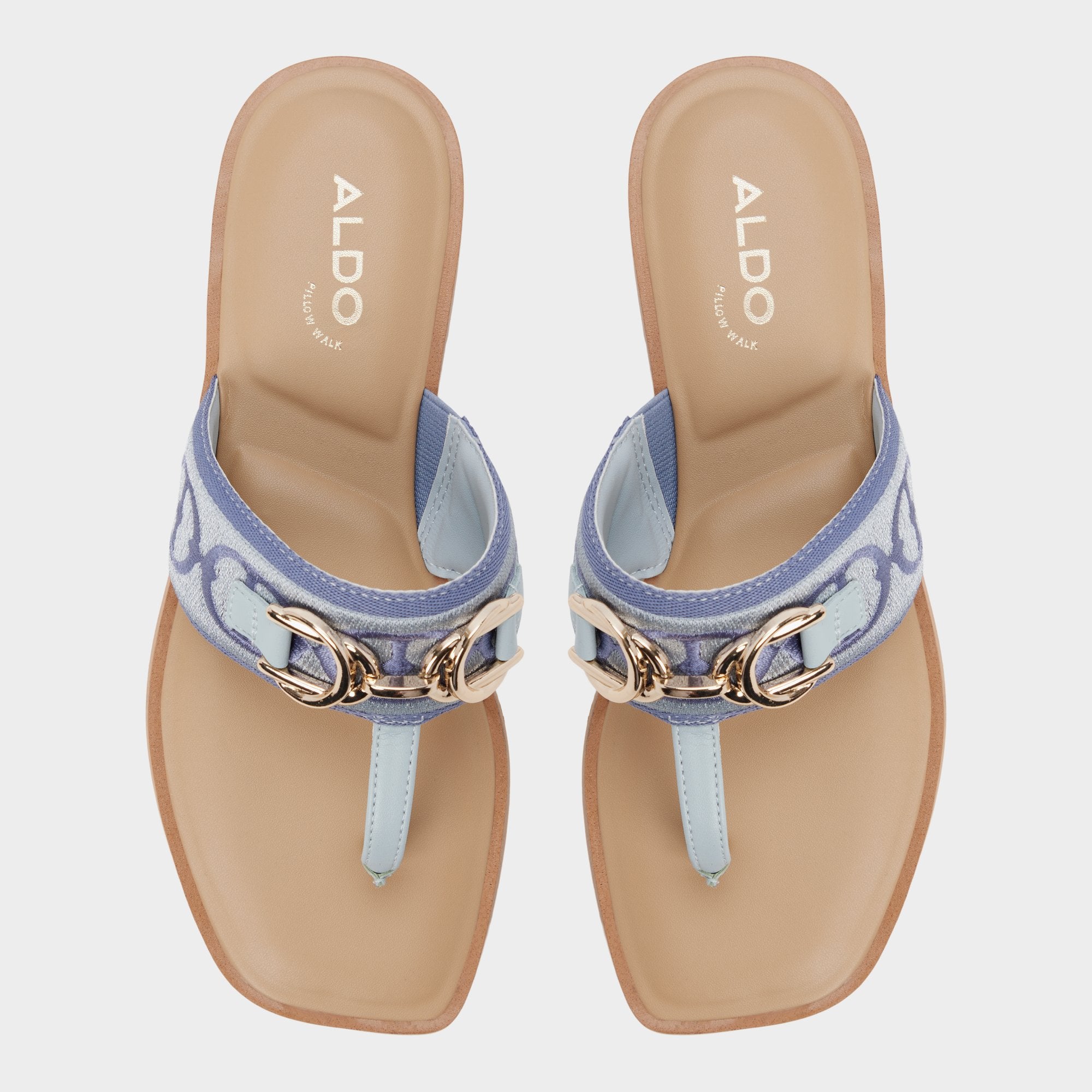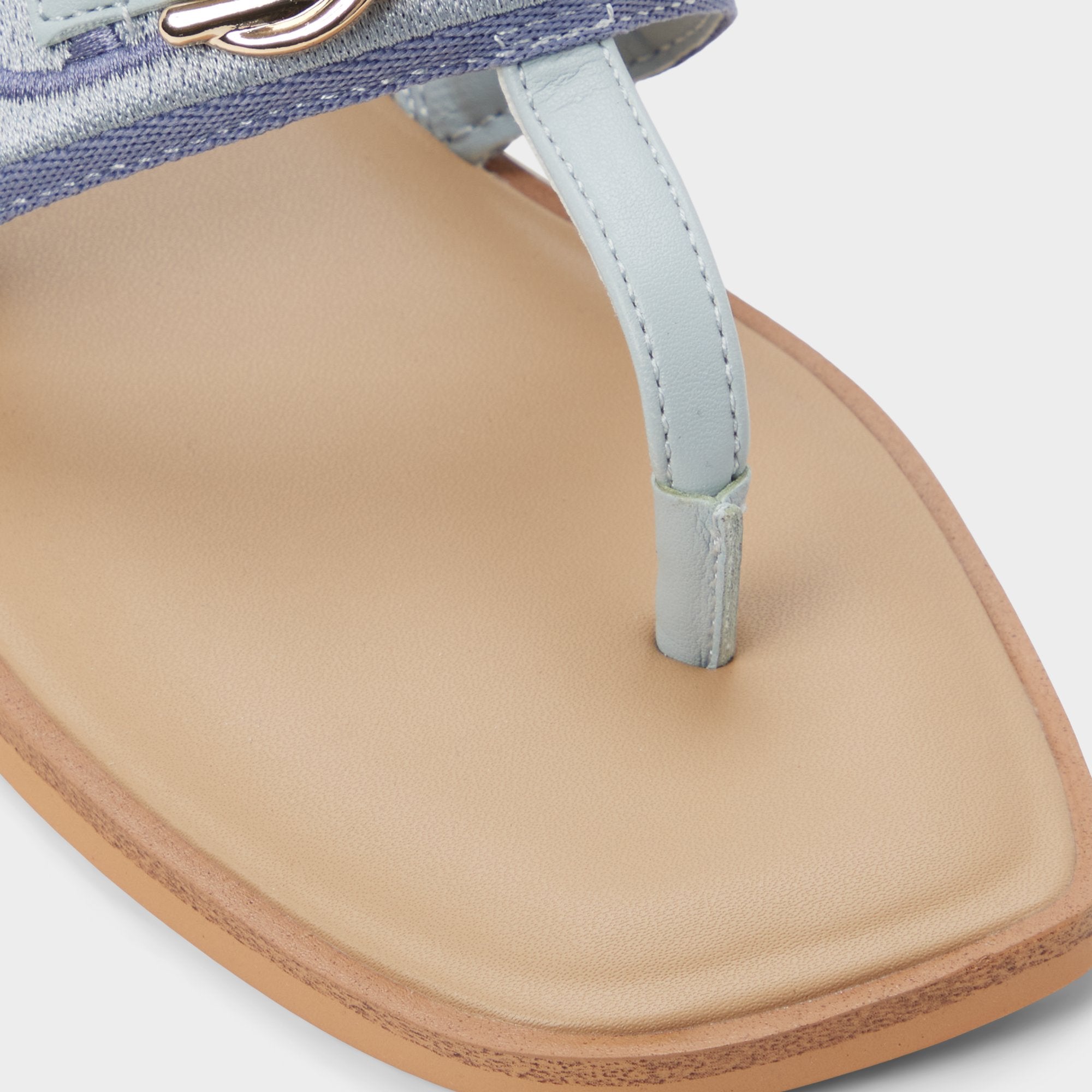 Denim-blue jacquard crowns a wide strap thong sandal, brushed-gold buckle lining lending quiet polish, while a flexible flat keeps movement easy from city staircases to sunlit boardwalks for spontaneous city days. Pair with white cutoffs for farmers-market loops, or slip beneath a breezy midi for sunset strolls.