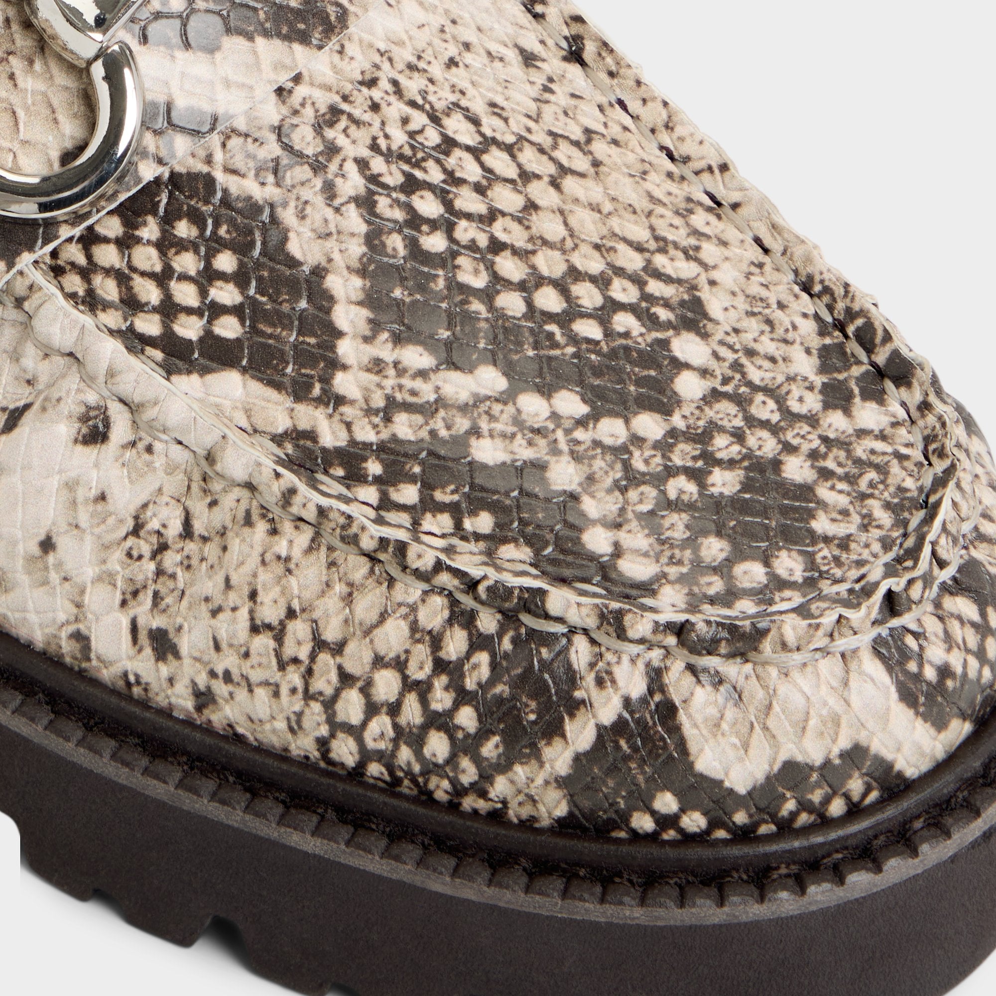 Bold faux-snakeskin elevates this bit-trimmed loafer, while a chunky lug sole adds confident lift and edgy swagger to every stride from morning pitches to after-work city strolls, catching light as you move with polished, wearable drama. Pair with ankle-skimming trousers for sharp office days, or swap in raw-hem denim for weekend indie-market wanderings.