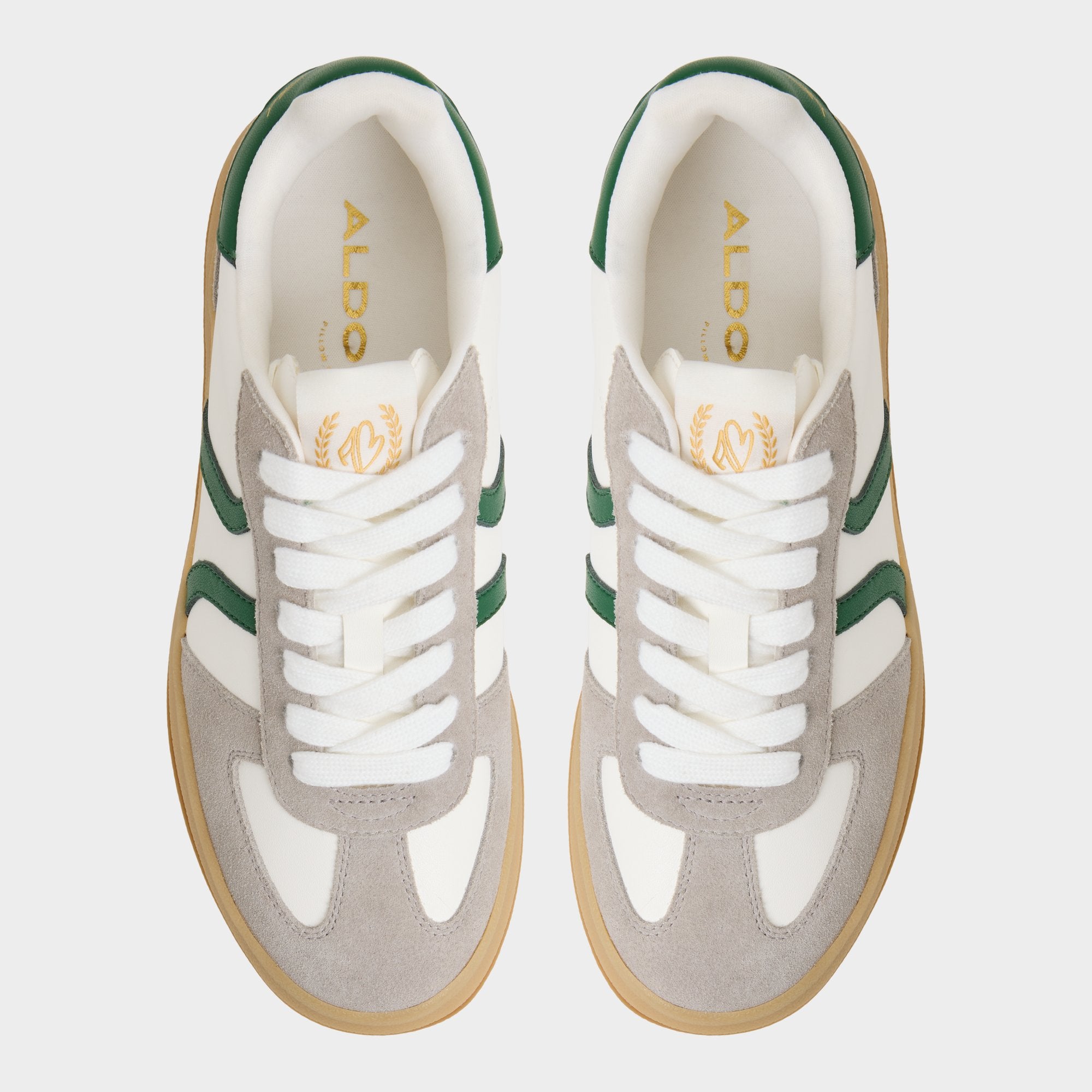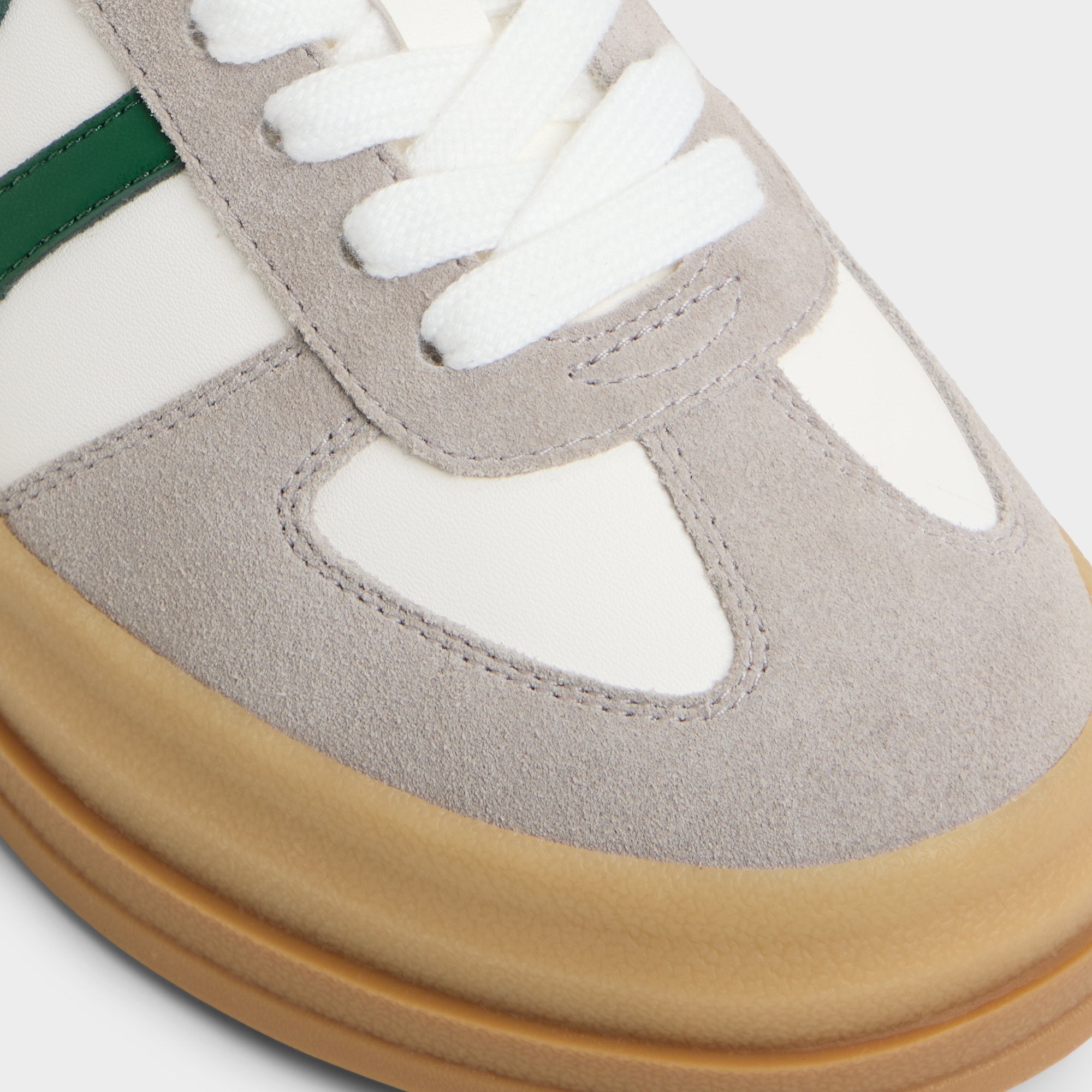 Stadium-ready green stripe races across smooth leather and suede, riding a chunky gum platform that adds confident height and a bold, crowd-pleasing silhouette you can wear beyond game day, from sidewalks to after-hours. Pair with cropped denim for a sporty brunch, or ground with satin skirts for city-hops and rooftop celebrations.