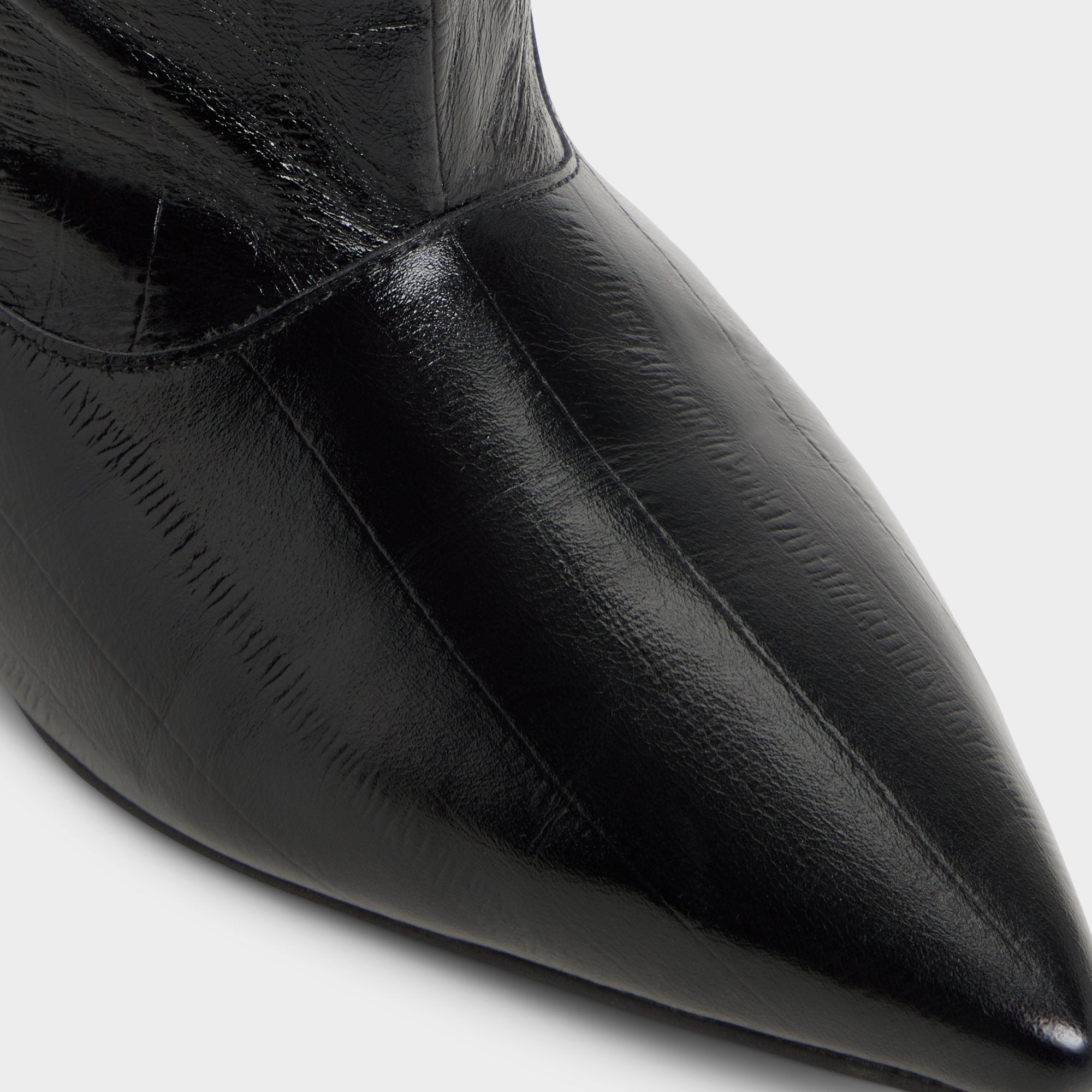 Midnight-gloss leather climbs to the knee in a clean column, while a poised kitten heel and pointy toe give subtle power that moves smoothly from sidewalk strut to late-show lounge. Ground a sweater-dress for crisp office mornings, or pair with leather shorts when rooftop cocktails trade daylight for city sparkle.