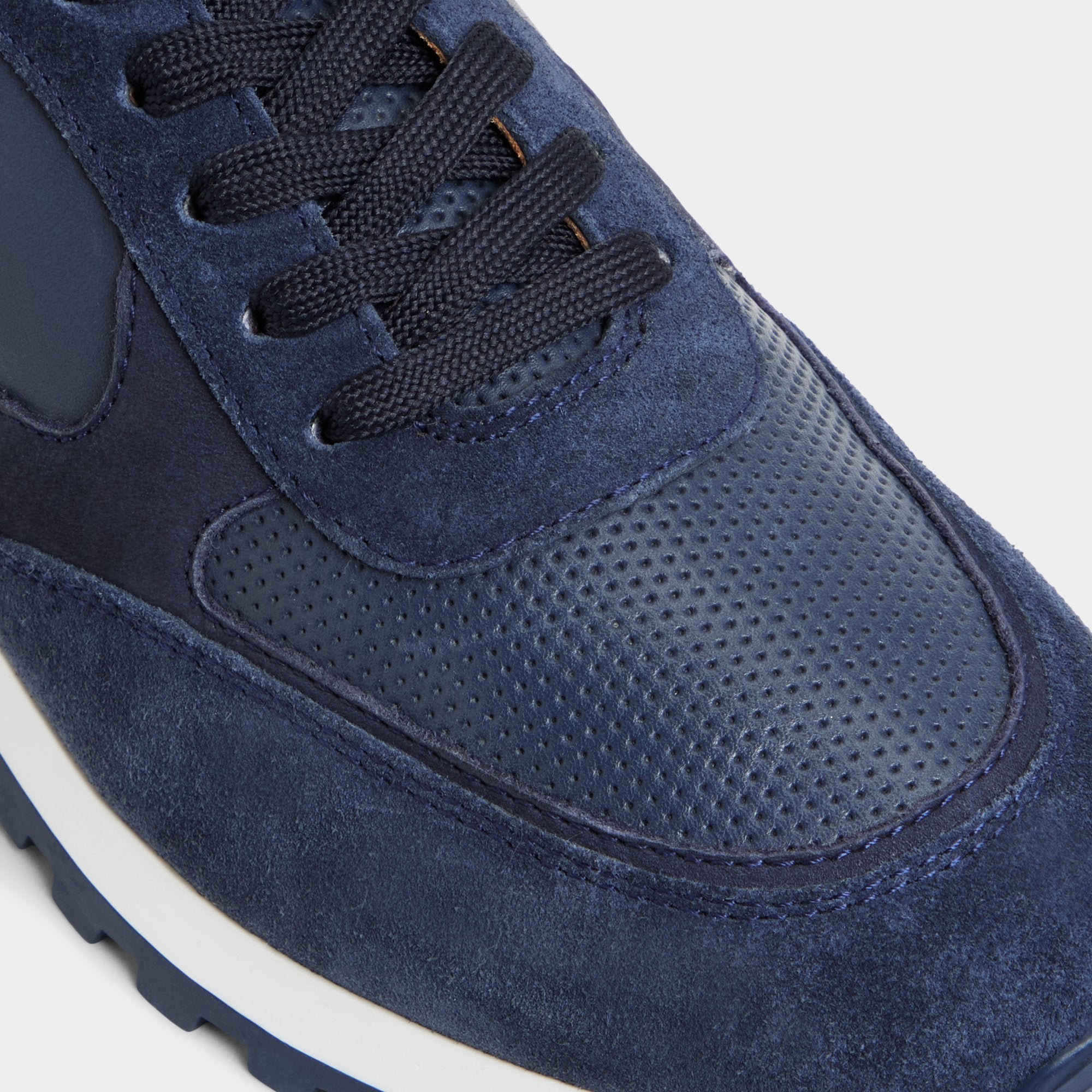 Midnight-blue suede pairs with smooth leather panels on this jogger, catching light across contrast textures as a cushioned rubber sole keeps daily miles easy and the silhouette ready for coffee runs or longer city strolls. Team it with cuffed chinos for patio brunches, or roll with jogger pants on red-eye flights.