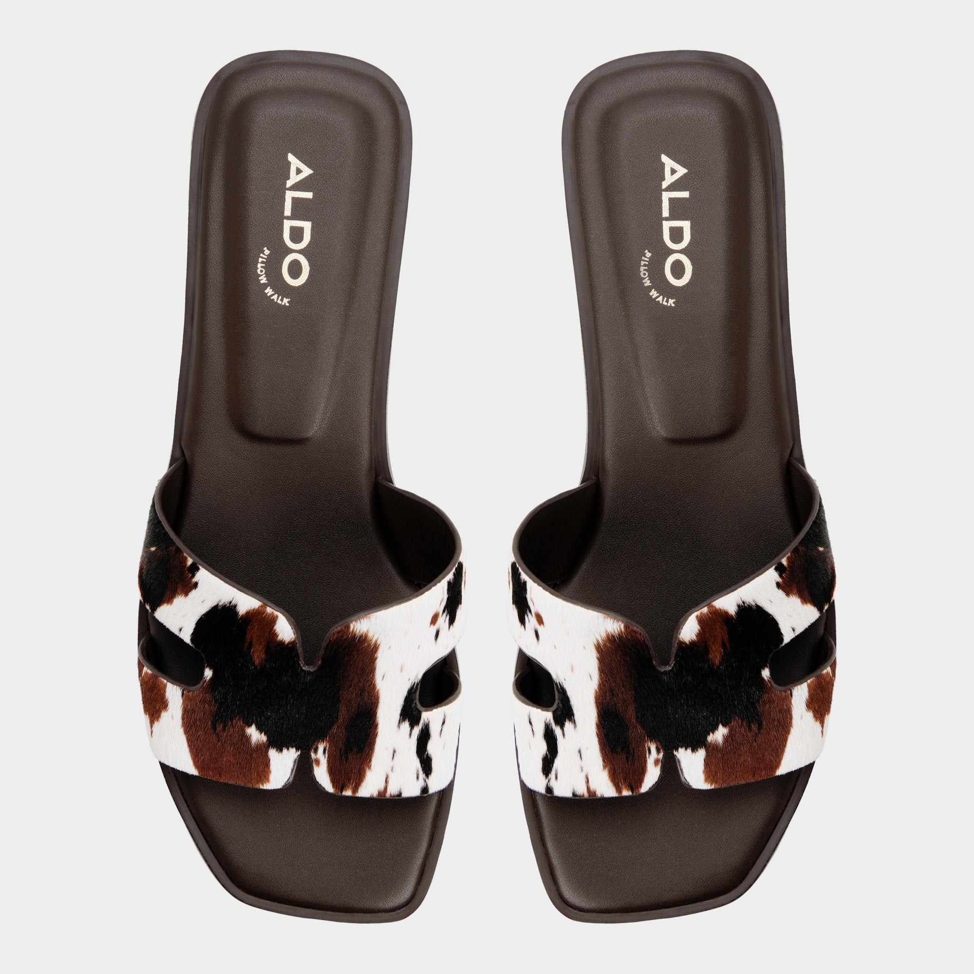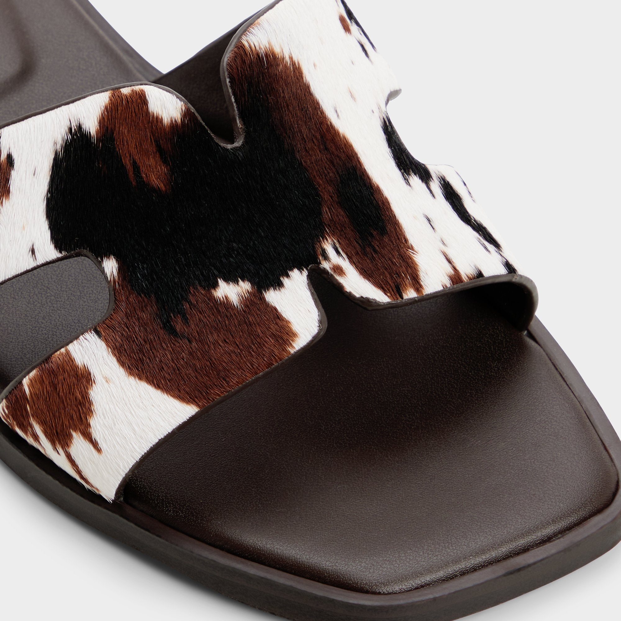 Spotted haircalf cow-print adds fearless flair to these cut-out slides, and a supple leather footbed cushions every step, keeping comfort chic from sunlit sidewalks to candlelit dinners. Pair with white denim for brunch, or slip beneath a sundress for patio strolls and sunset dates, ready for city nights.