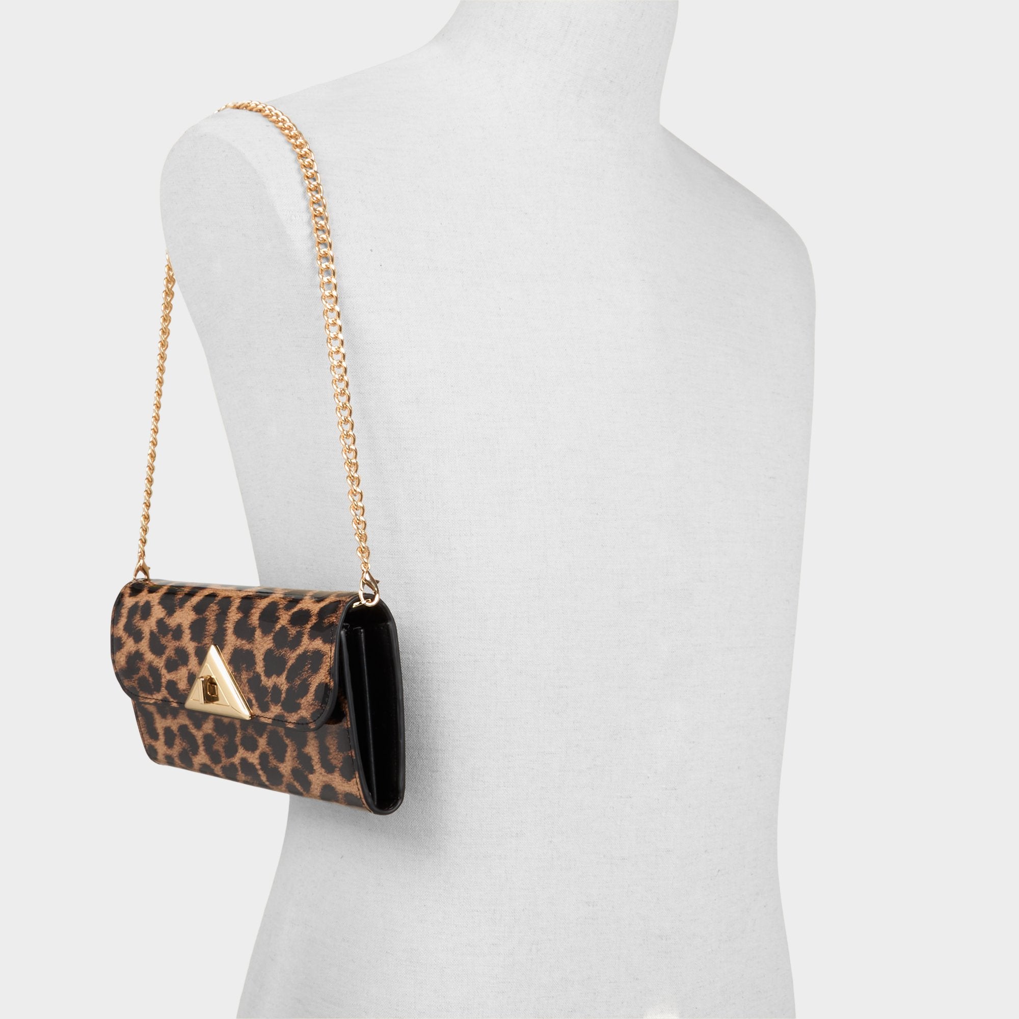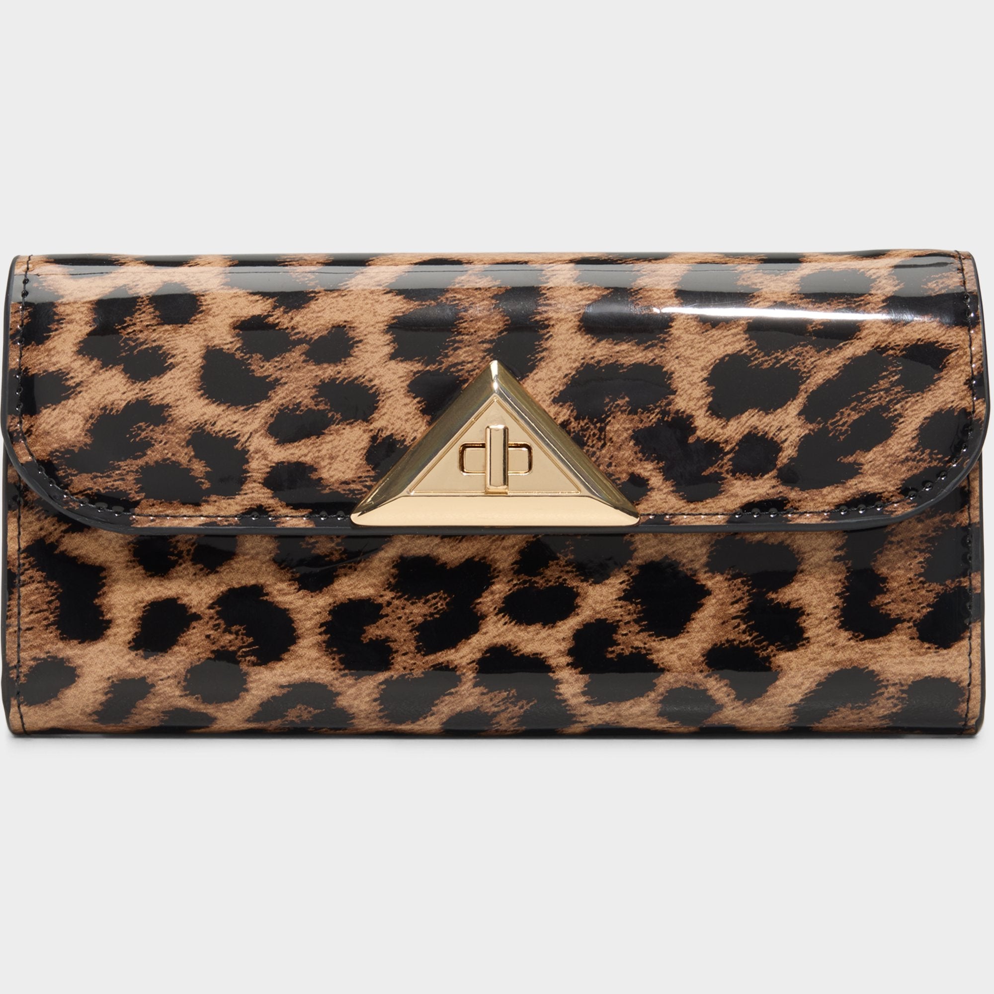 Leopard patent gleams with confident glow, turning every look into a statement, while a bold triangular gold clasp anchors the mood and keeps essentials secure in a single, satisfying click. Carry it with a sleek slip for rooftop cocktails, or tuck it under a blazer with jeans and heels for last-minute city nights.