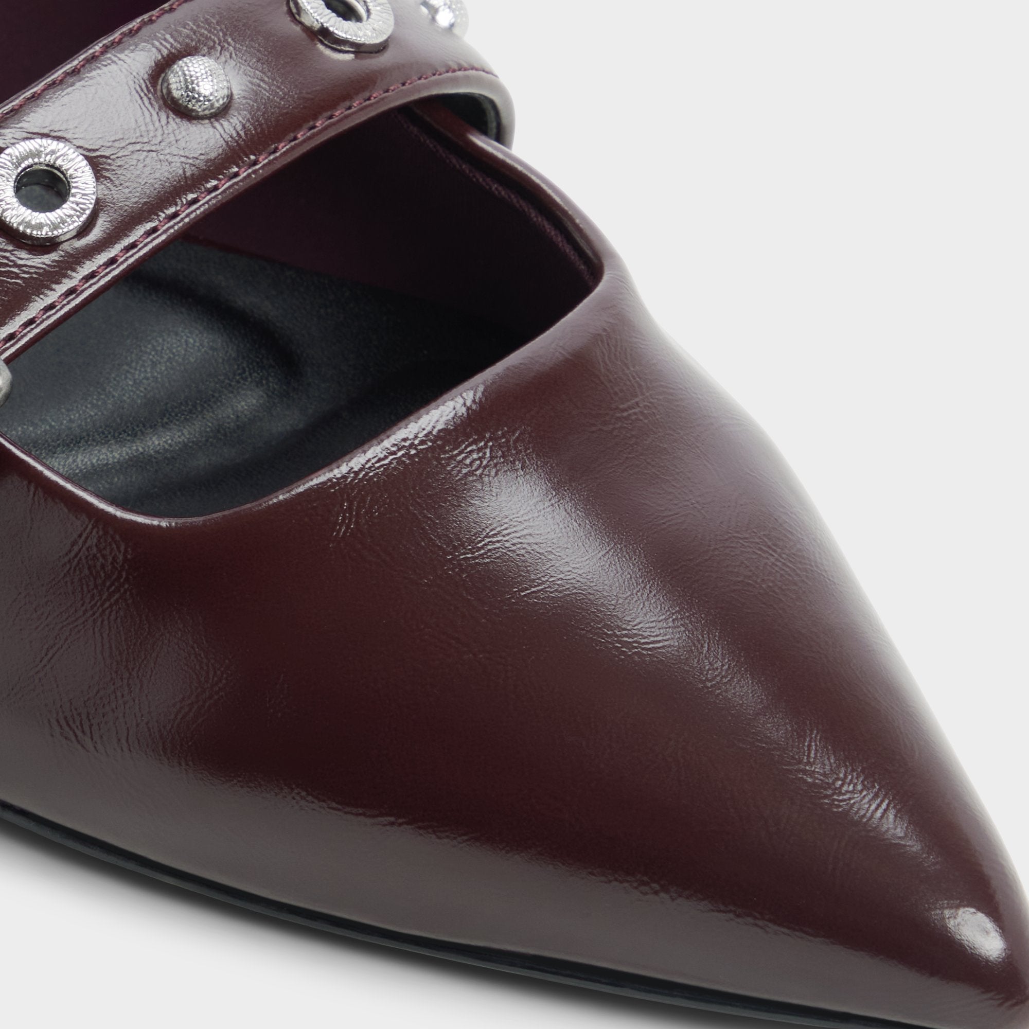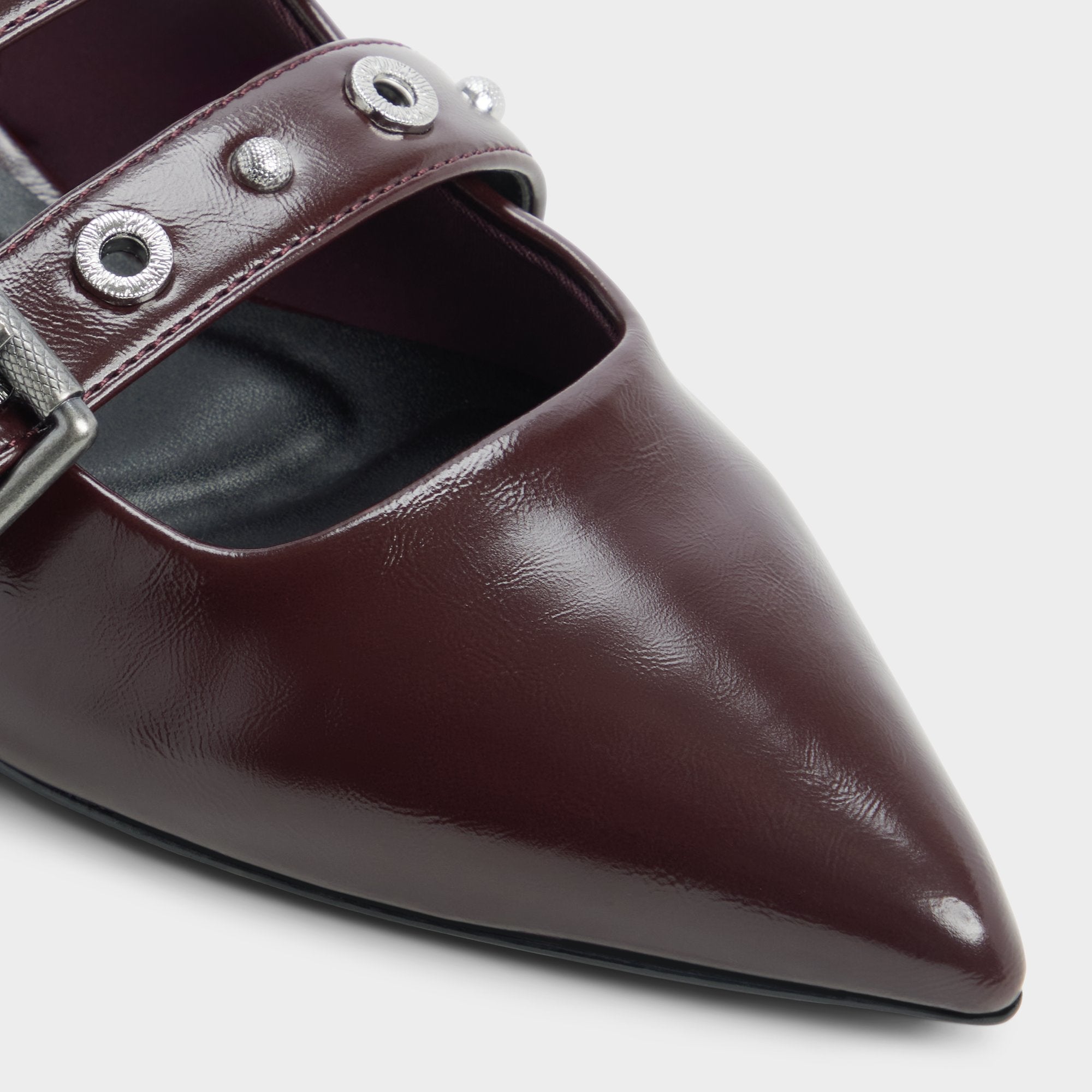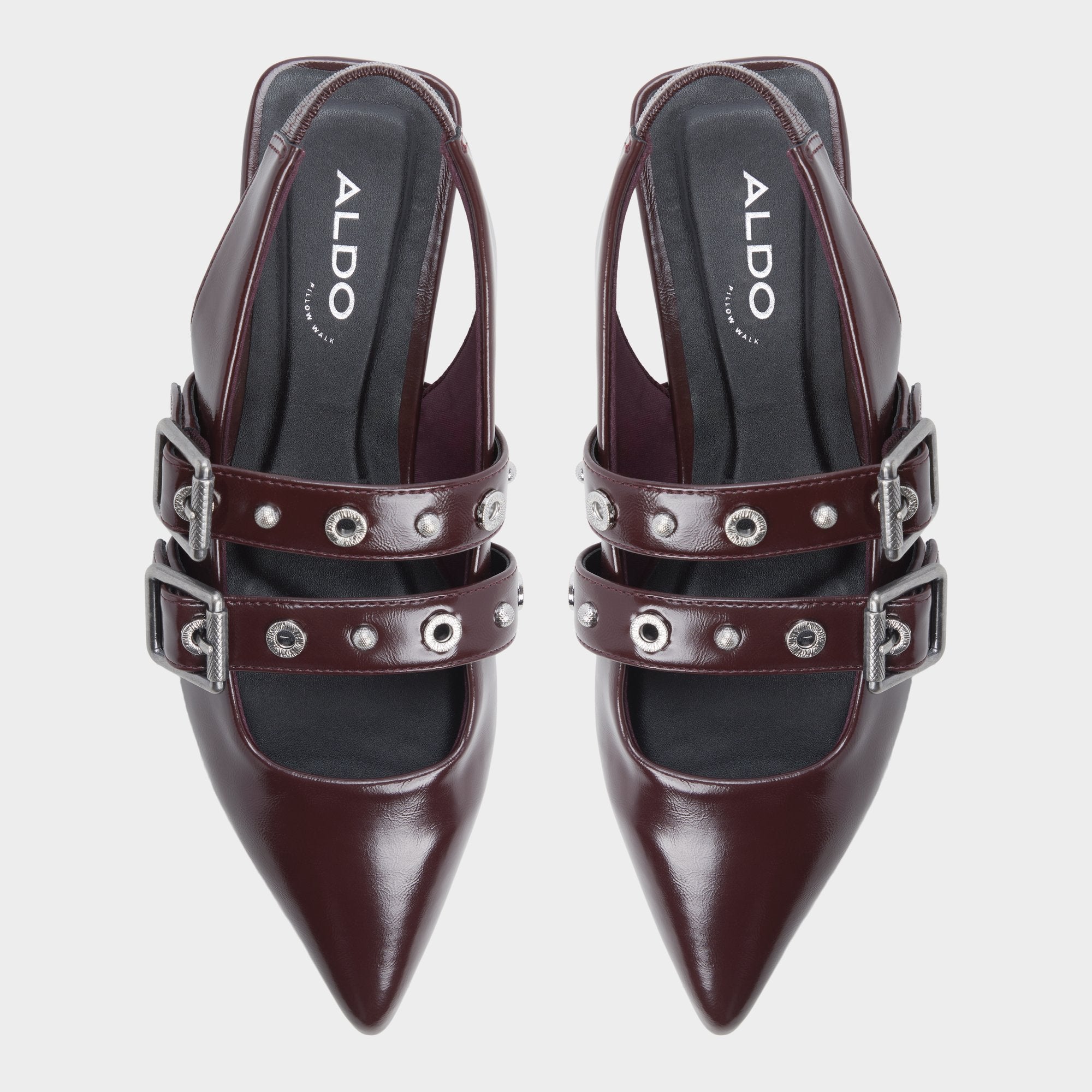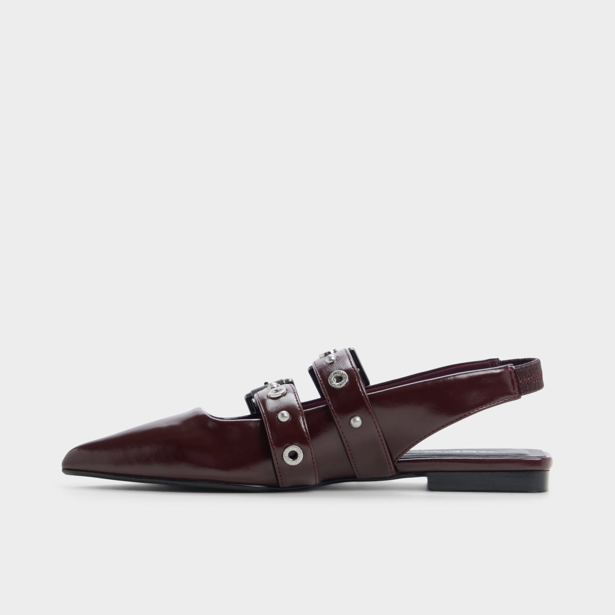 Sleek wine-hued leather meets twin polished buckles on a pointed slingback flat, offering quiet edge and day-long ease with cushioned lining and a barely-there heel that keeps strides smooth from brainstorm huddle to gallery detour. Pair with tailored trousers for pitch days, or slip in under a skirt when date-night streets call.