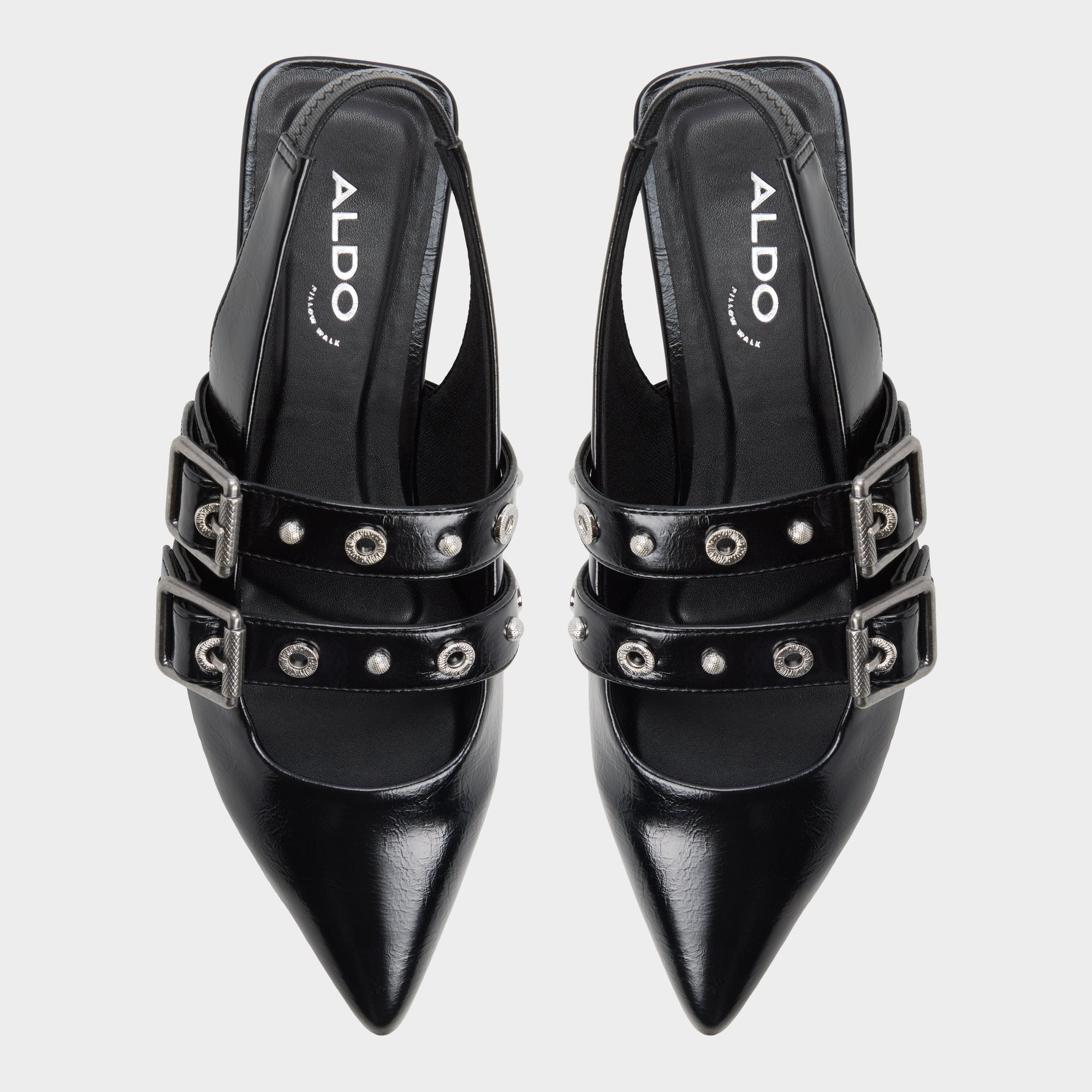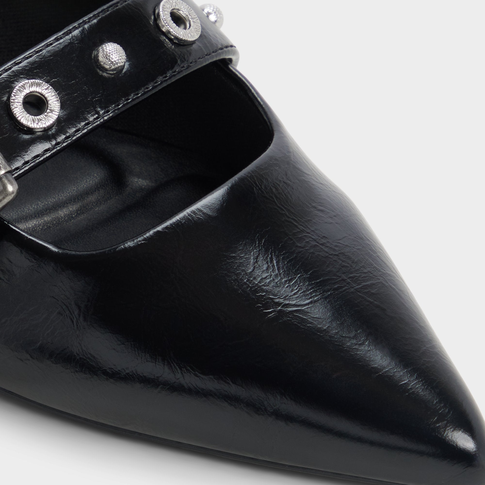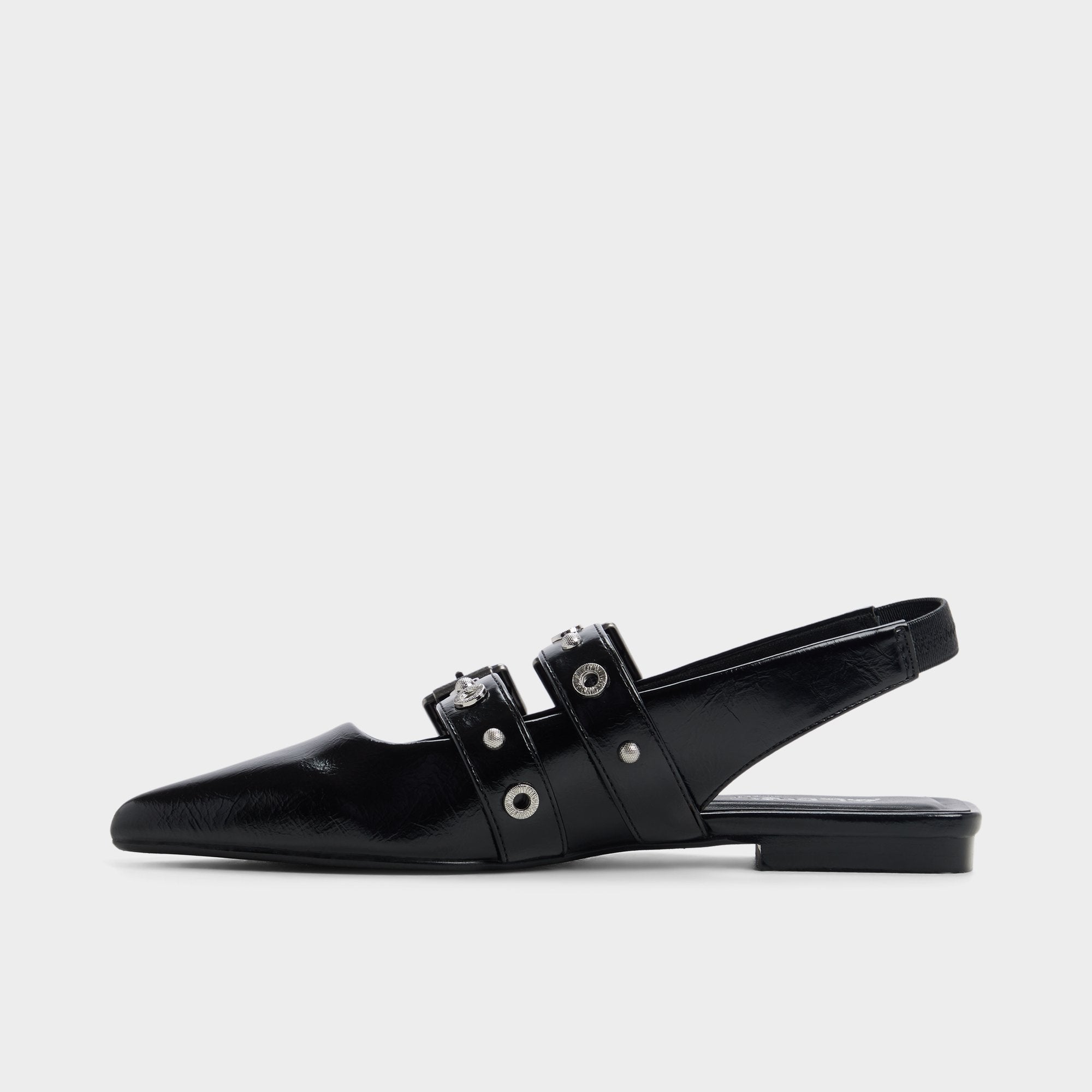 Glossy patent leather sharpens this slingback flat with a sculpted pointy toe and twin metal buckles flashing quiet rebellion, while a barely-there heel keeps every stride confident and smooth all day. Pair with tailored ankle trousers for client brunch, or swap into a satin slip skirt once gallery lights dim late.