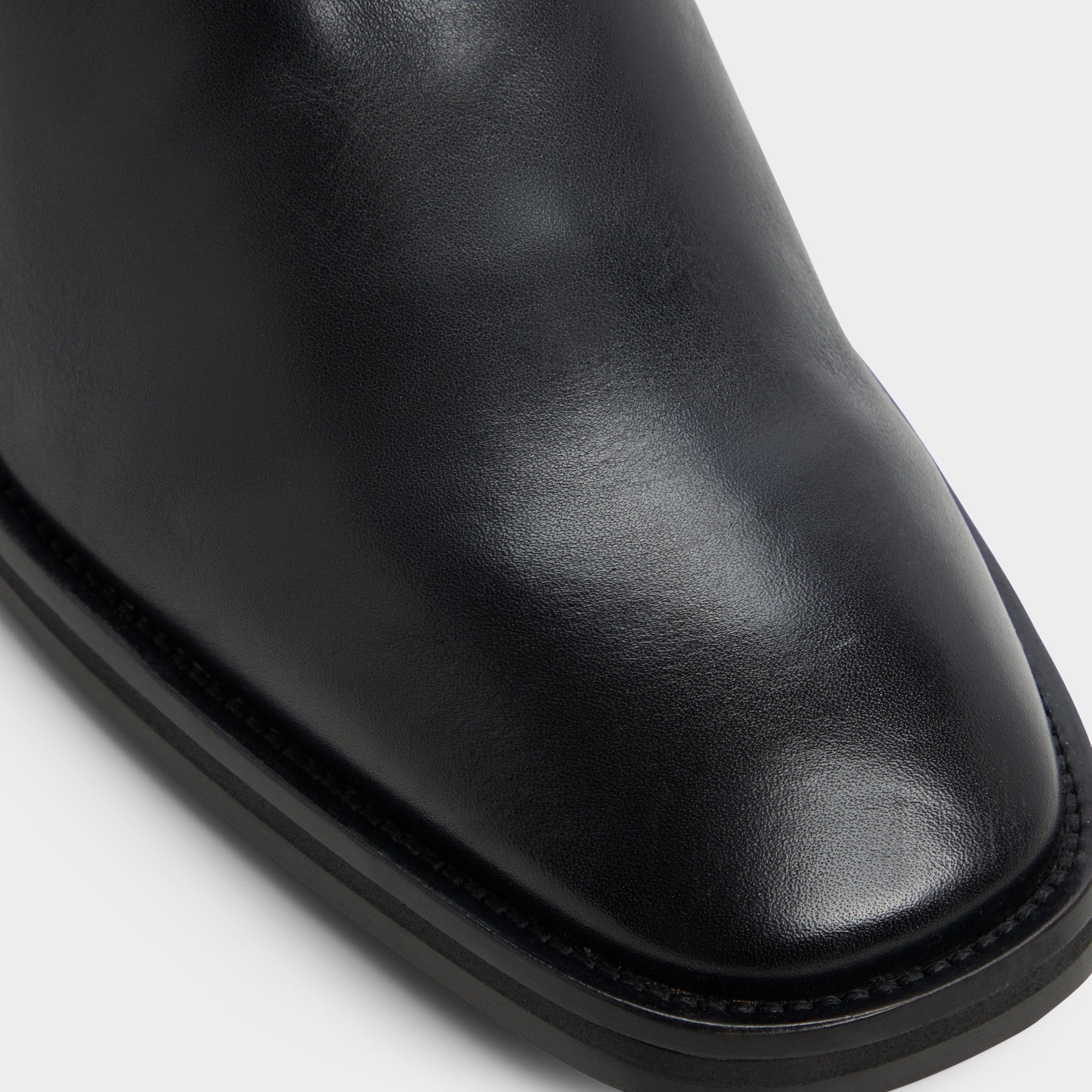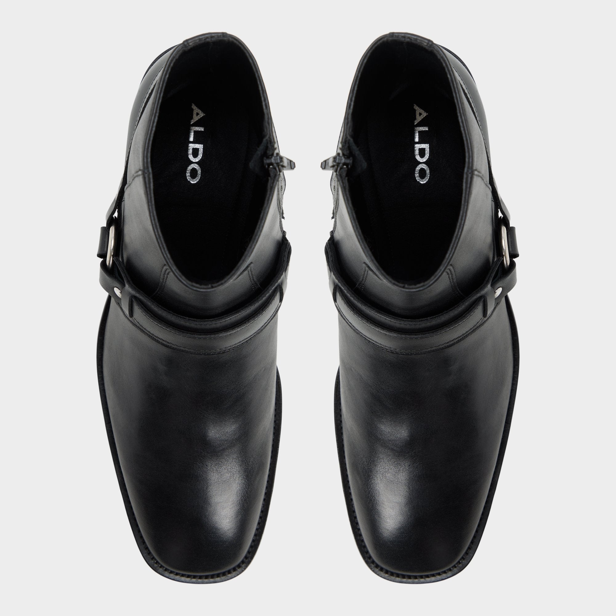 Black leather rides high on attitude thanks to a harness-style strap cinched by a ring, while side zip and block heel keep the ankle boot easy on the go. Anchor slim black denim for gigs or sharpen a charcoal suit at work-its confident edge never blinks.