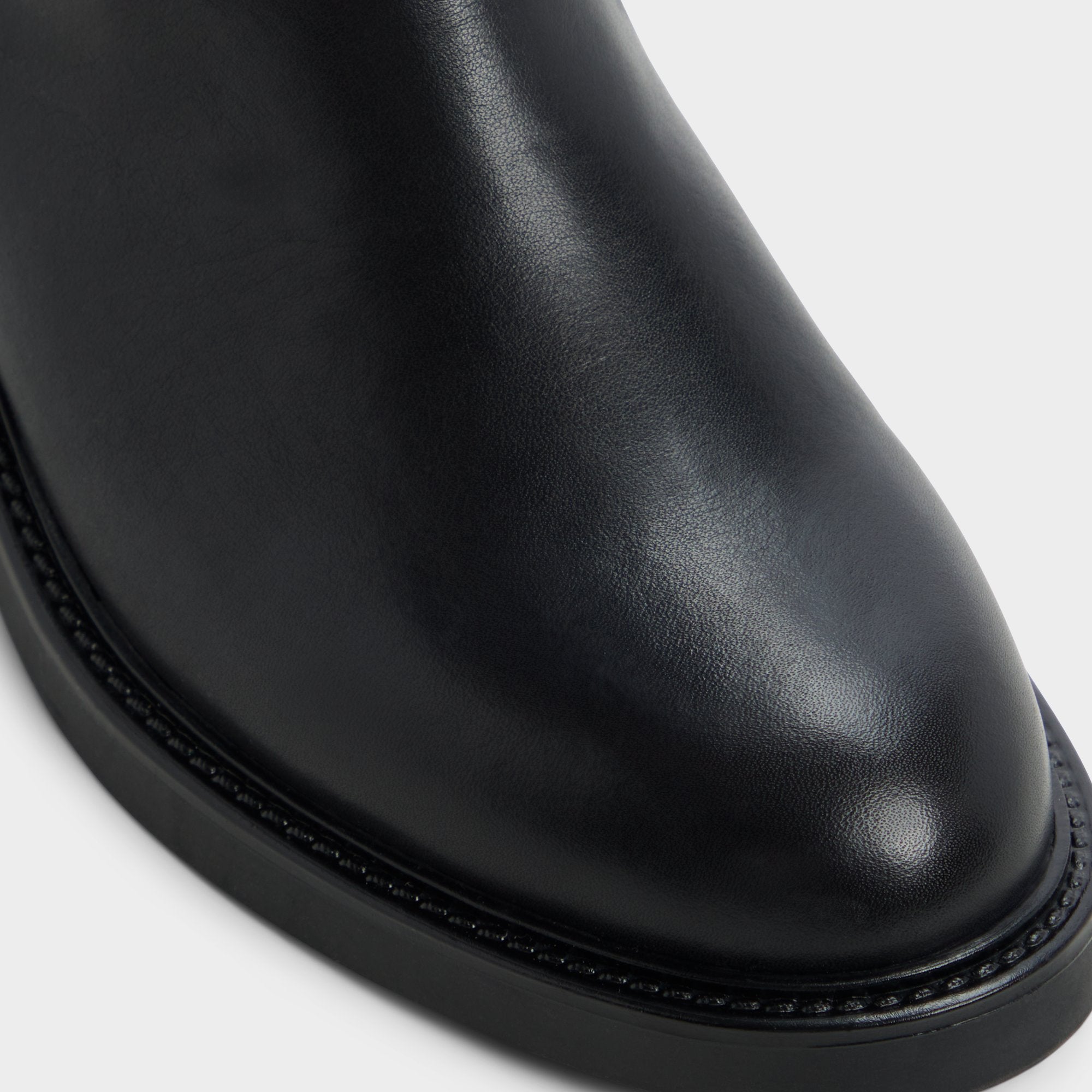 Supple black leather rises knee-high in a clean riding silhouette, with a harness-style buckle strap and a low block heel that lend subtle edge and all-day steadiness for city strolls, commutes, and evenings out. Pair with slim jeans for coffee-to-commute, or slip into a knit midi as museum afternoons melt into rooftop cocktails.