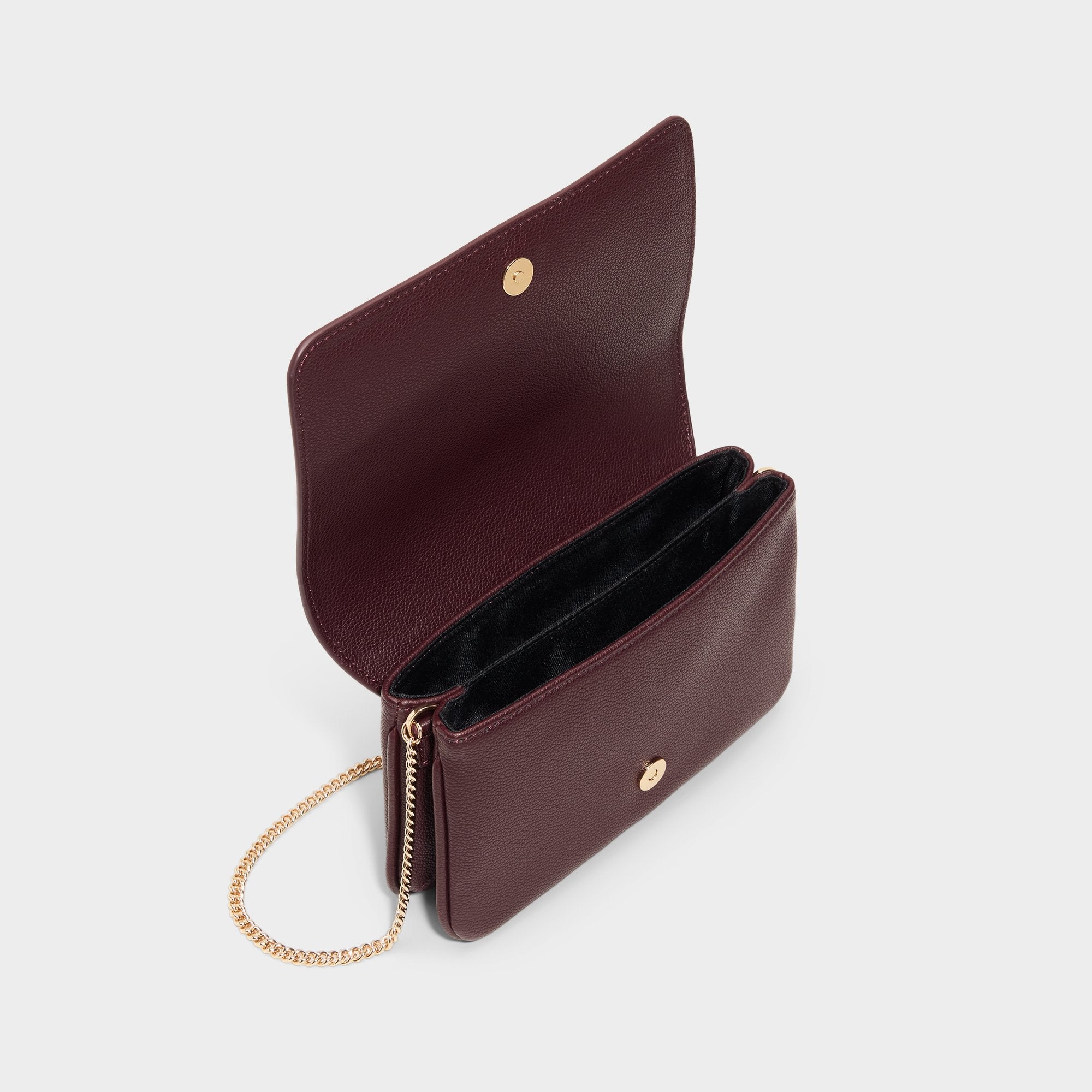 Deep burgundy pebble leather outlines clean lines, with a gold chain strap draping the flap silhouette like jewelry, closing with a hidden magnet to secure cards and gloss. Carry it with a satin midi for dinner reservations or sling it over boyfriend jeans on coffee runs to polish everything.