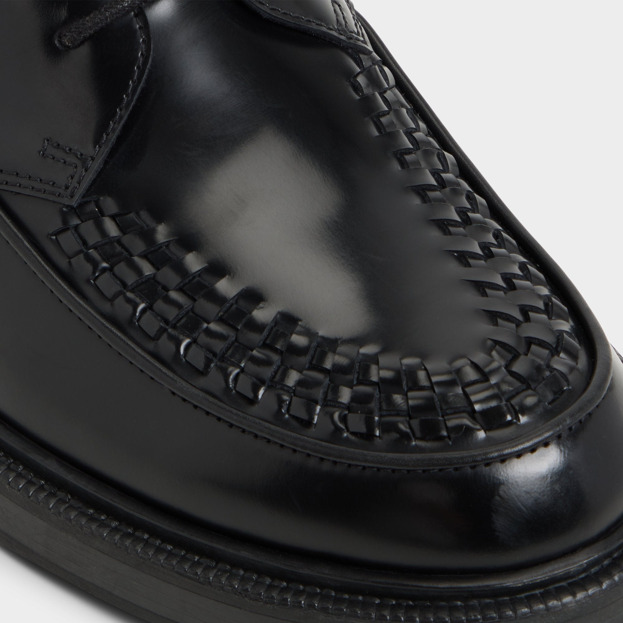 High-shine leather meets a woven apron on this Oxford, giving classic lines a fresh edge, while a rubber lug sole cushions the rush from boardroom briefings to midnight gigs. Anchor slim charcoal suiting for client pitches or roll with cuffed black jeans at after-dark sets—the vamp sparks conversation effortlessly.