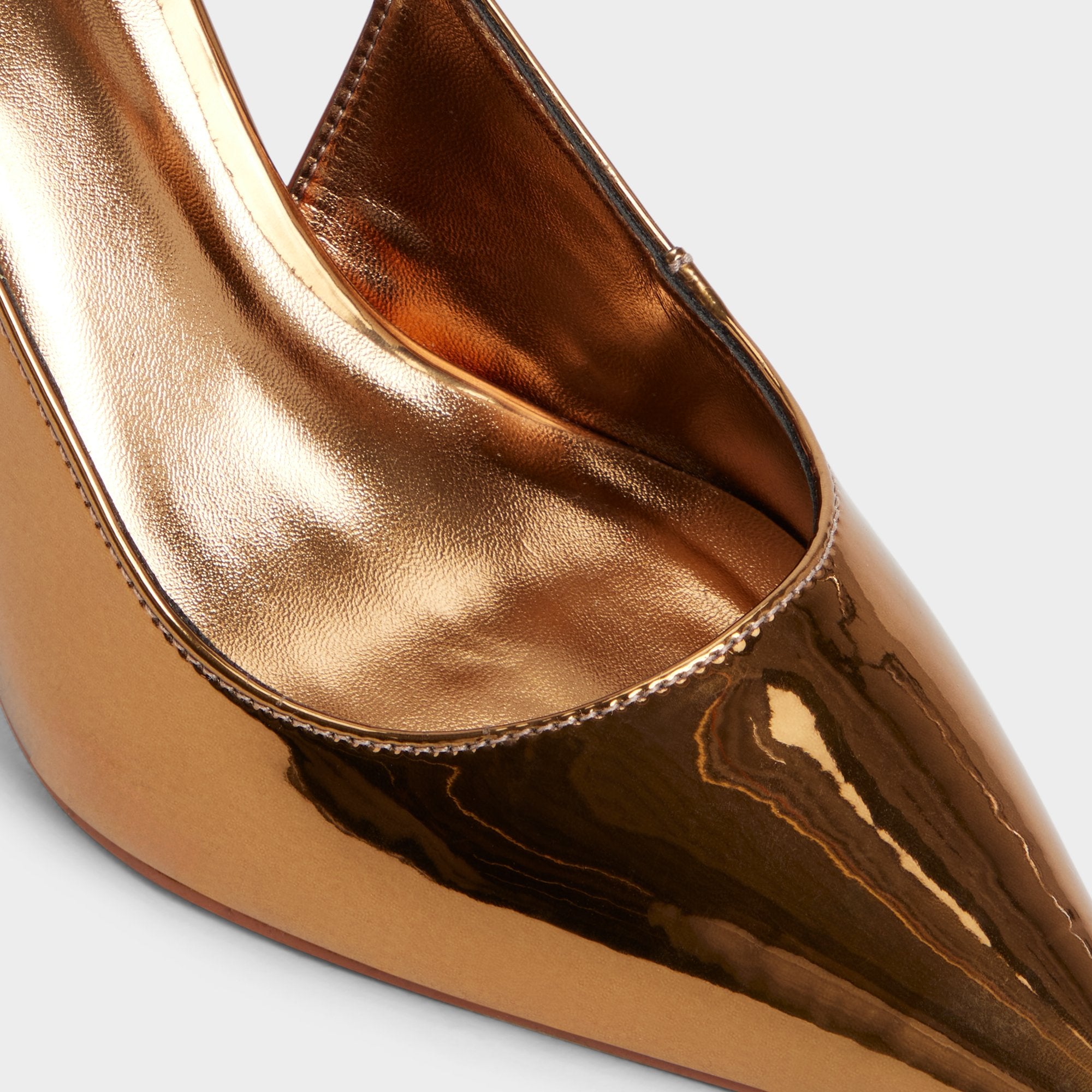 Molten metallic leather covers this razor-sharp point-toe slingback, pairing a slim stiletto with an adjustable buckle to give your stride edge as neon lights sweep every confident step through the city. Pair with sleek suiting for presentation mornings, or swap in a satin mini for nights out.