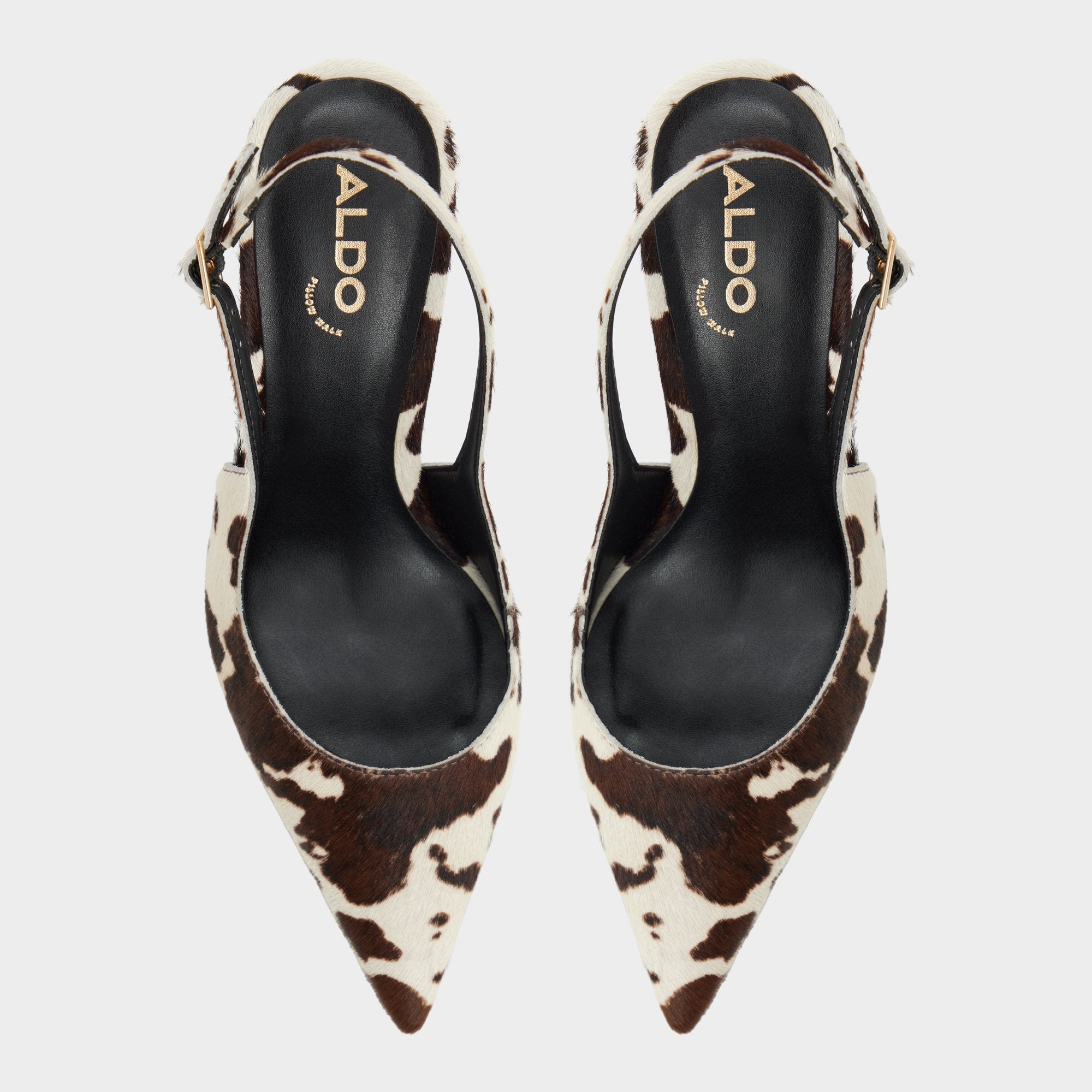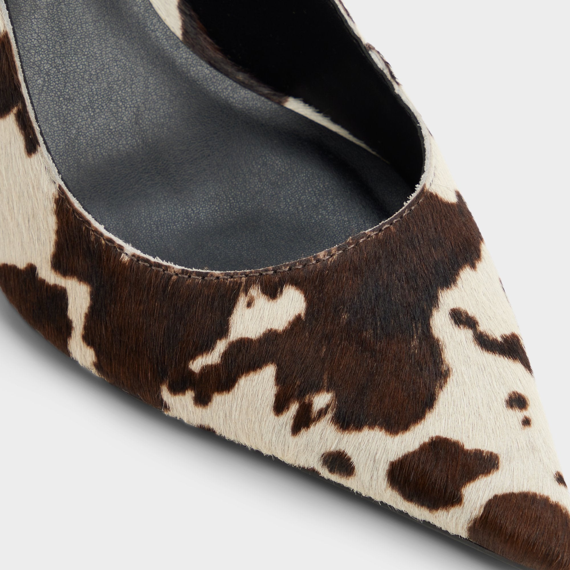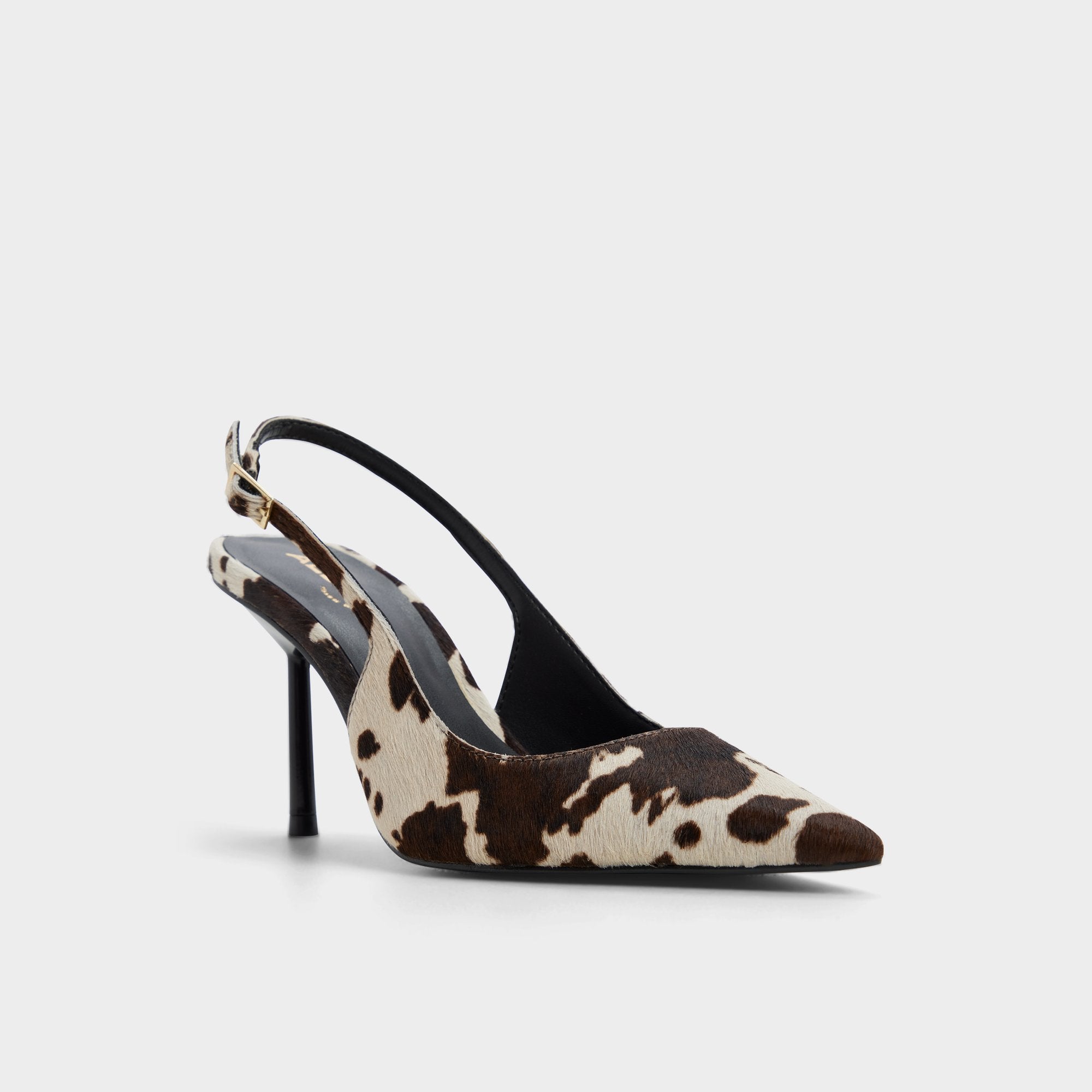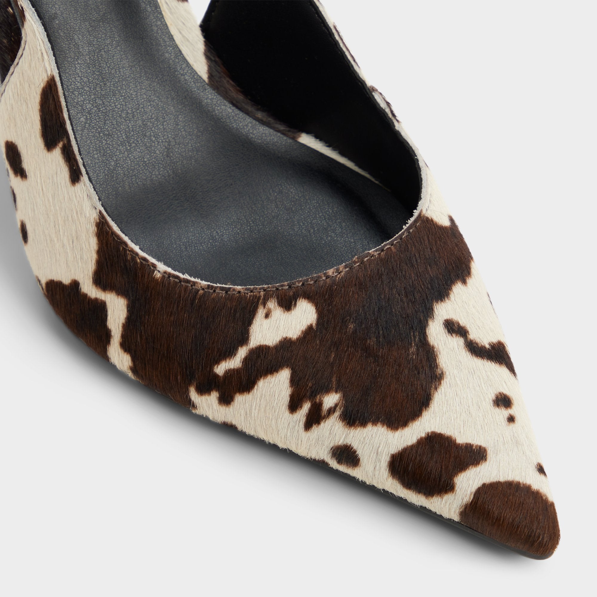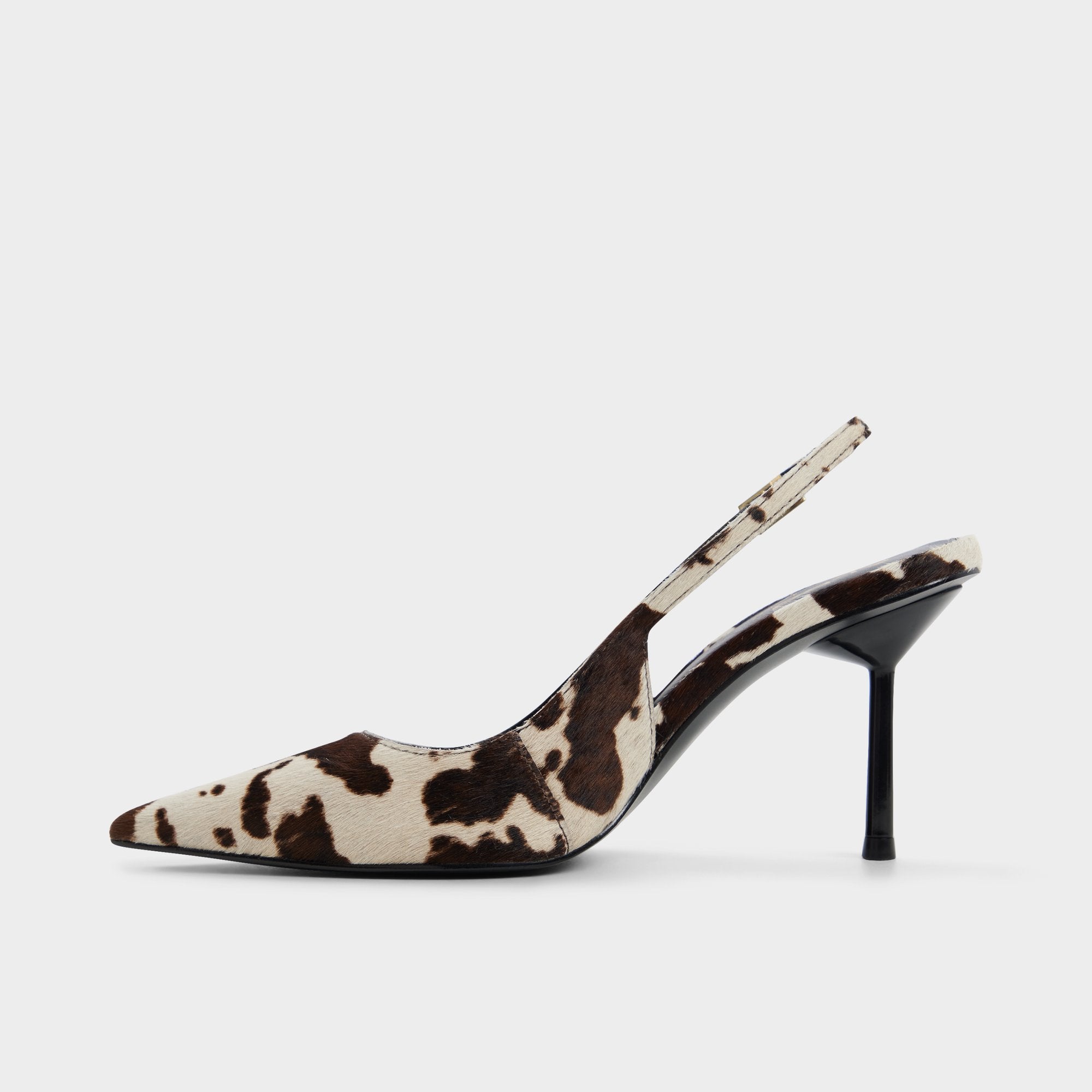 Wild cow-print fabric sharpens the slingback with a razor-thin stiletto, while cut-away sides keep the silhouette sleek and bold, and soft cushioning makes every step comfortable. Pair with cropped cargos for downtown gallery hops, or slip under a silk suit for invitation-only rooftop soirees call your name tonight.