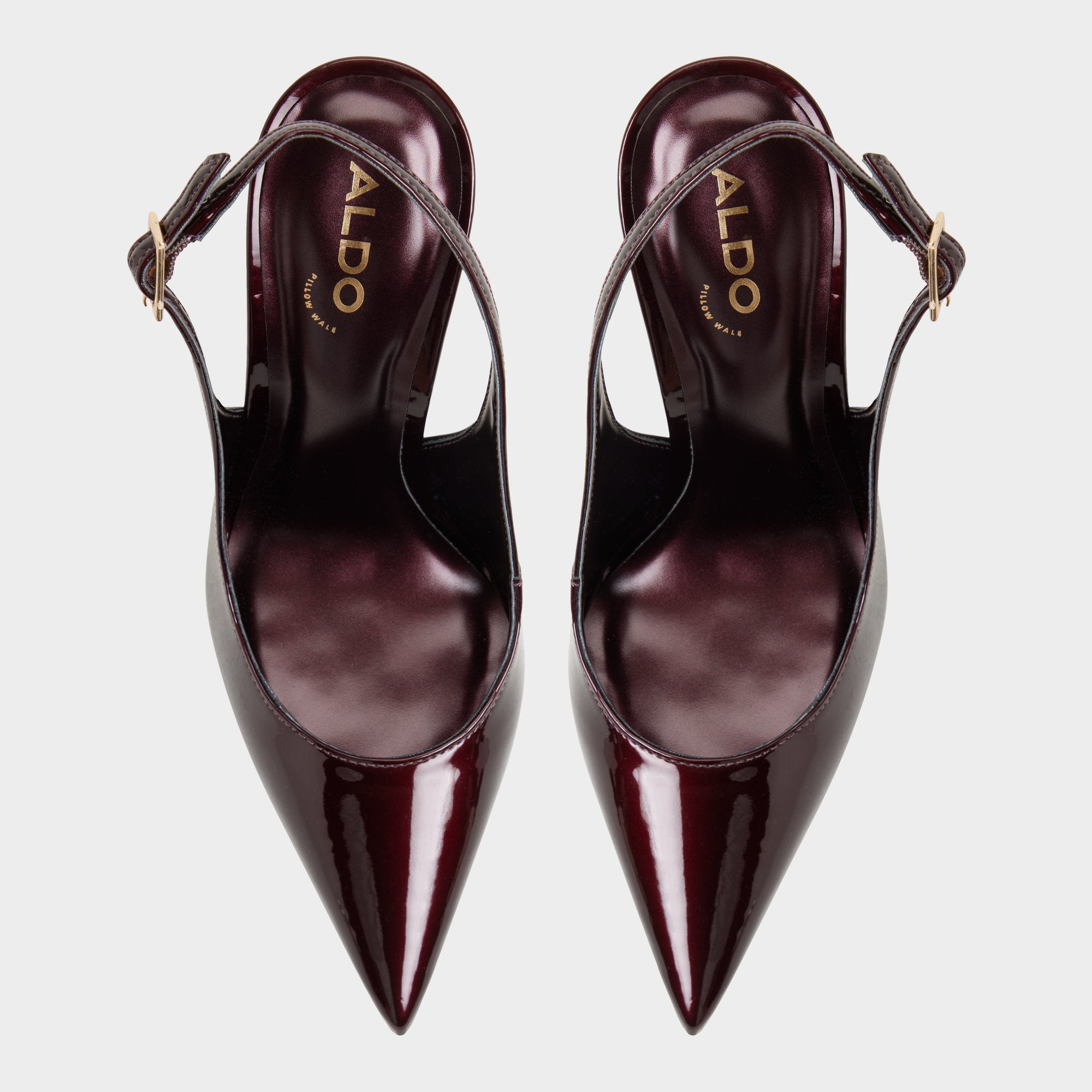 Burgundy patent wraps pointed slingbacks, soaring on razor stilettos that deliver after-dark confidence, while soft footbeds cushion every stride and the gleam of this heel height anchors the look in elegant, city-ready attitude. Pair with tailored trousers for gallery openings, or slip into a sleek slip dress for after-dark city strolls.