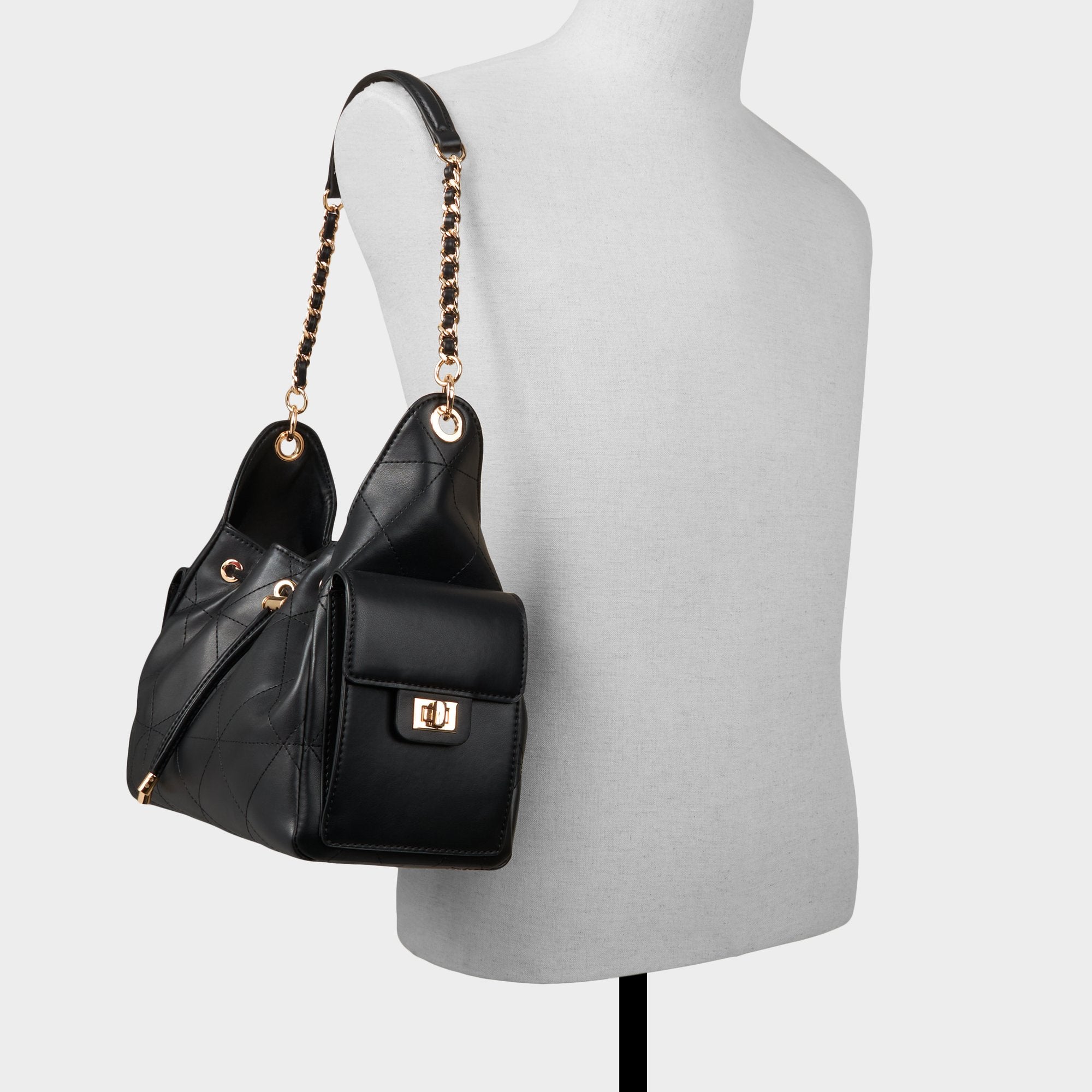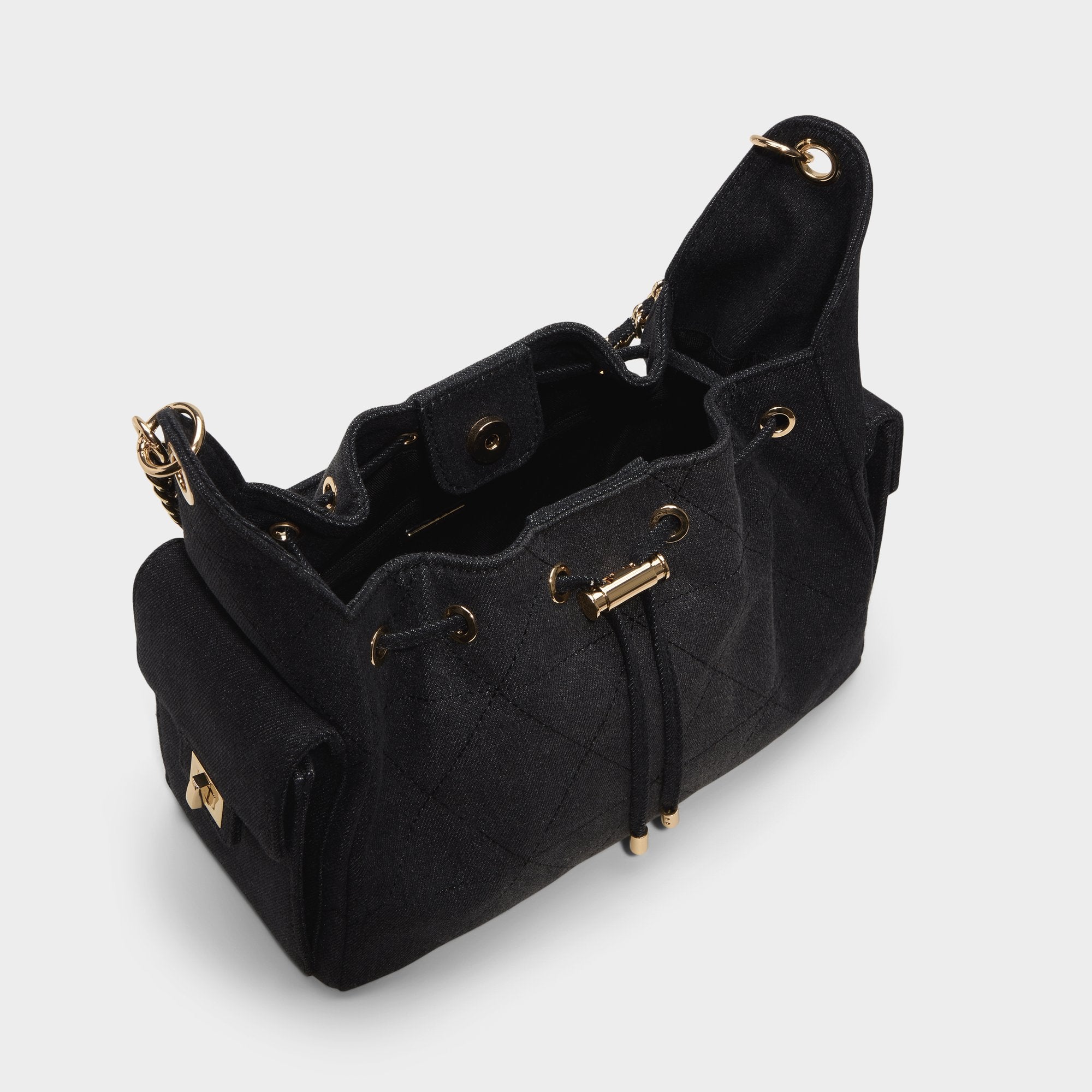 Plush quilted wool gives this bucket bag a cozy-luxe edge, and the gleaming gold chain handle meets a smooth drawstring top for polish that transitions effortlessly between daylight errands and after-dark plans. Sling it over a camel coat for campus coffee runs or tuck it against a slip dress at rooftop parties to pull everything together.