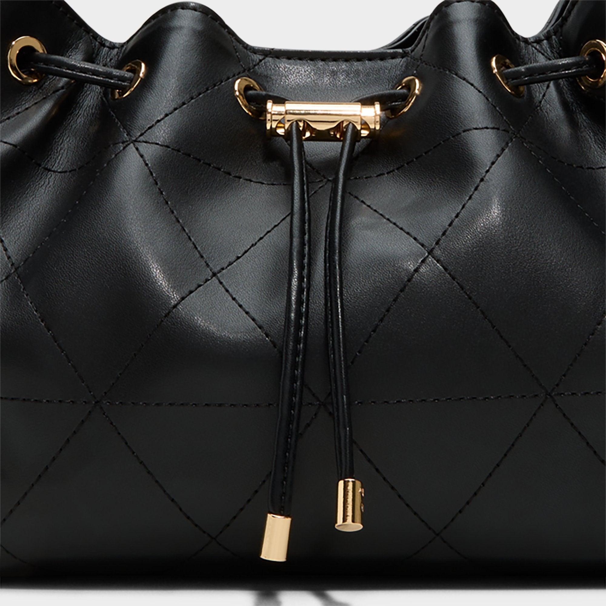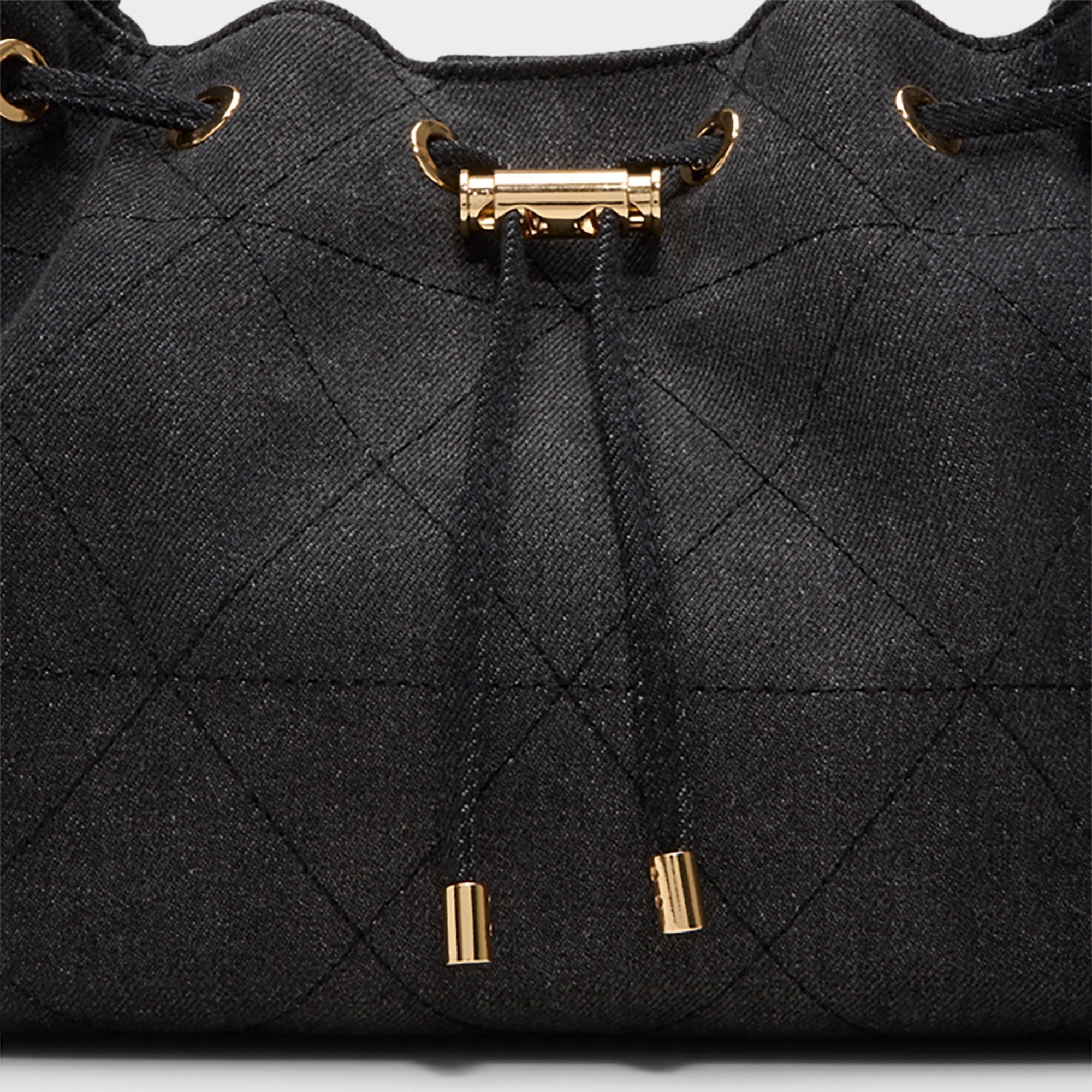 Supple leather is stitched into diamond quilting, cinched by a gleaming drawstring and topped with a leather-woven gold chain strap that swings with just enough polish for any occasion. Carry it with relaxed tailoring for office catch-ups or sling it over a slip dress after-dark, pulling everything together.