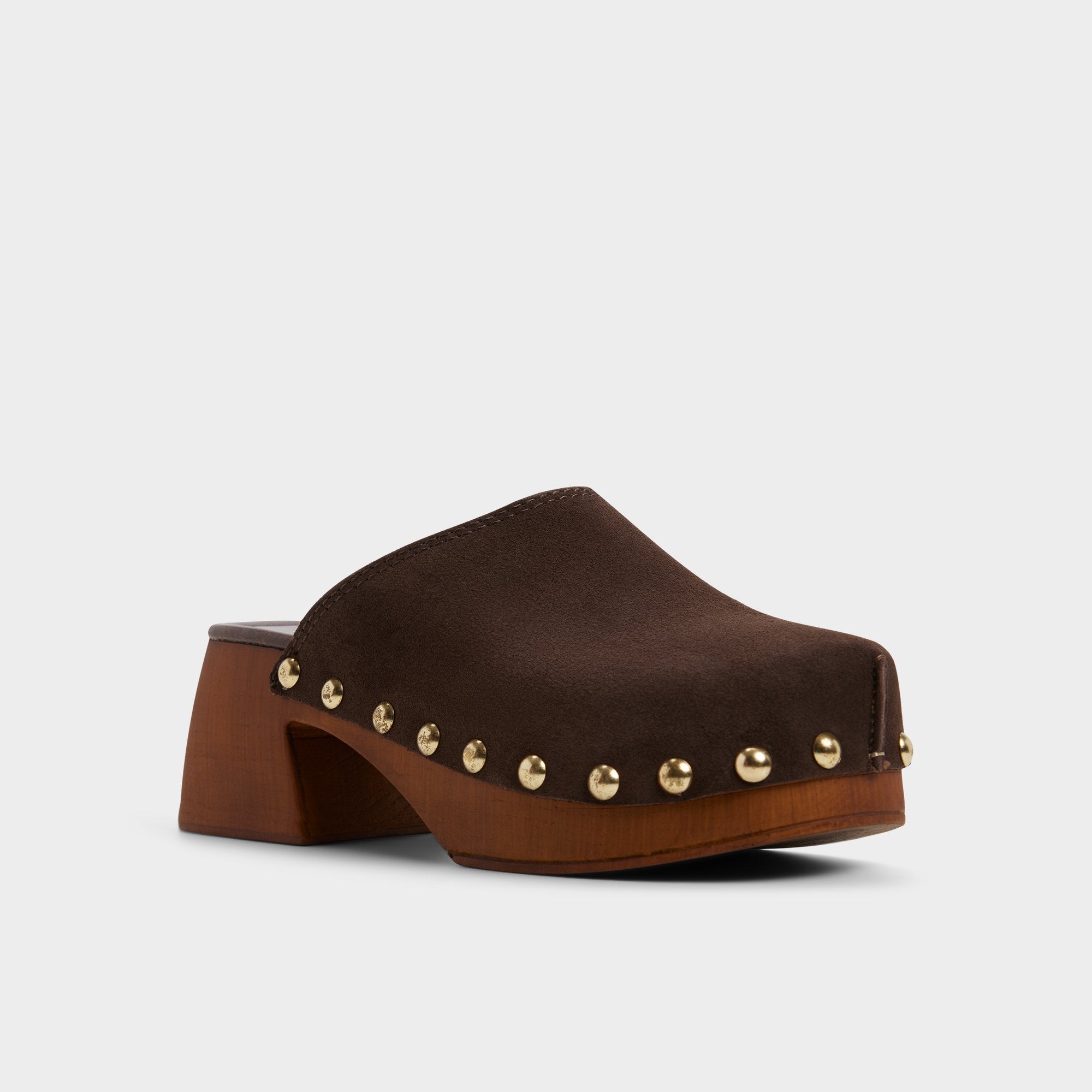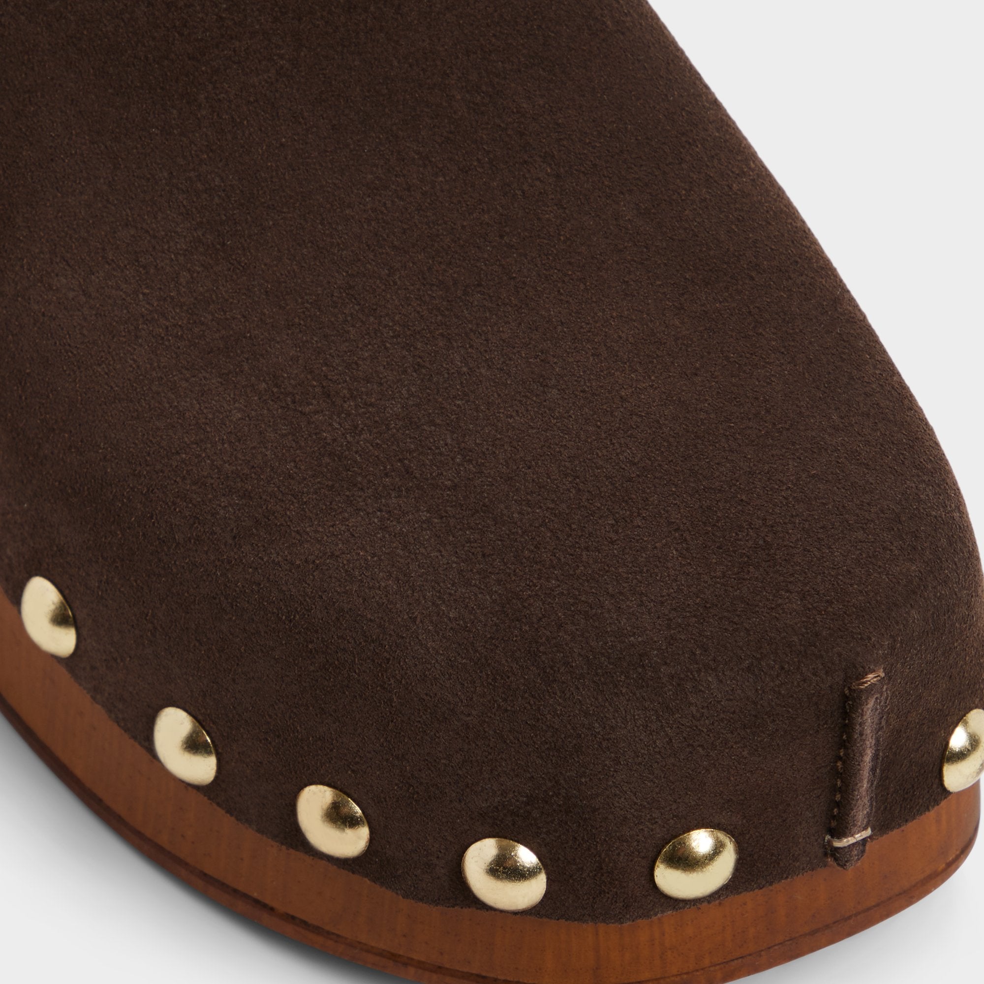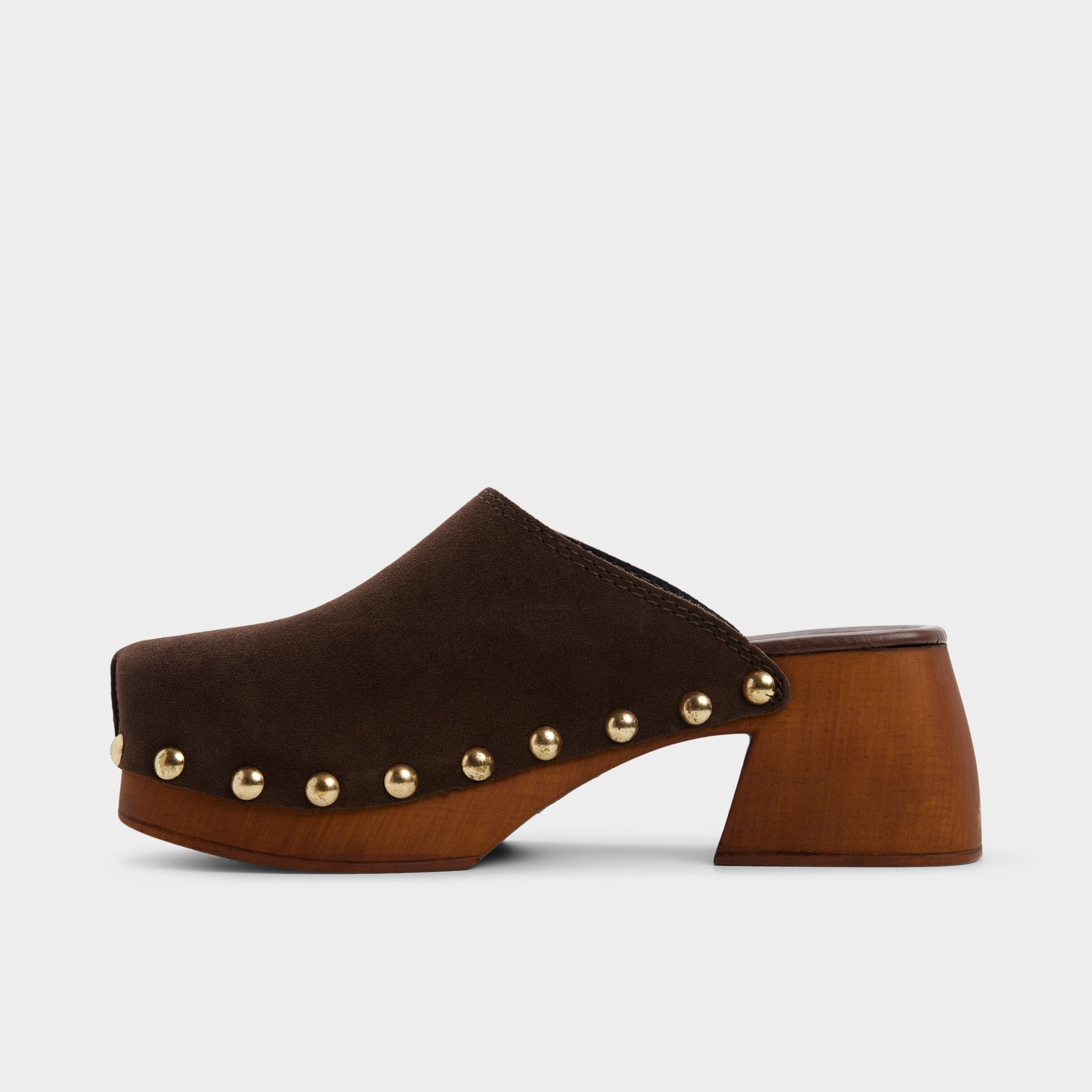Glossy gold studs trace the edge of a wood clog heel, pairing rich suede with cushioned insoles to create an easy-slide attitude that’s confident from morning errands to after-hours gallery hops. Pair with flared denim for market mornings, or anchor satin midis when gallery openings roll into wine-bar afterhours.