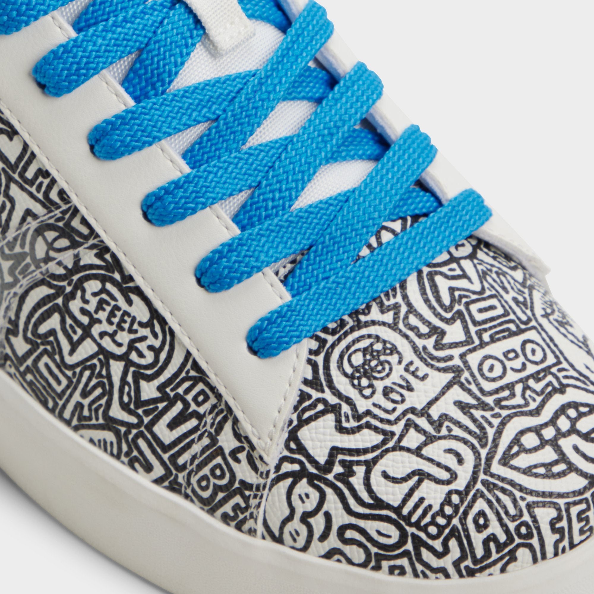 Synthetic uppers with graffiti-inspired flair and electric-blue laces give this low-top city energy, ready to turn sidewalks into runways, while a cushioned cup sole keeps every stride light and confident. Team with cuffed chinos for gallery visits, or roll with joggers for coffee runs—the bold print sparks conversations.