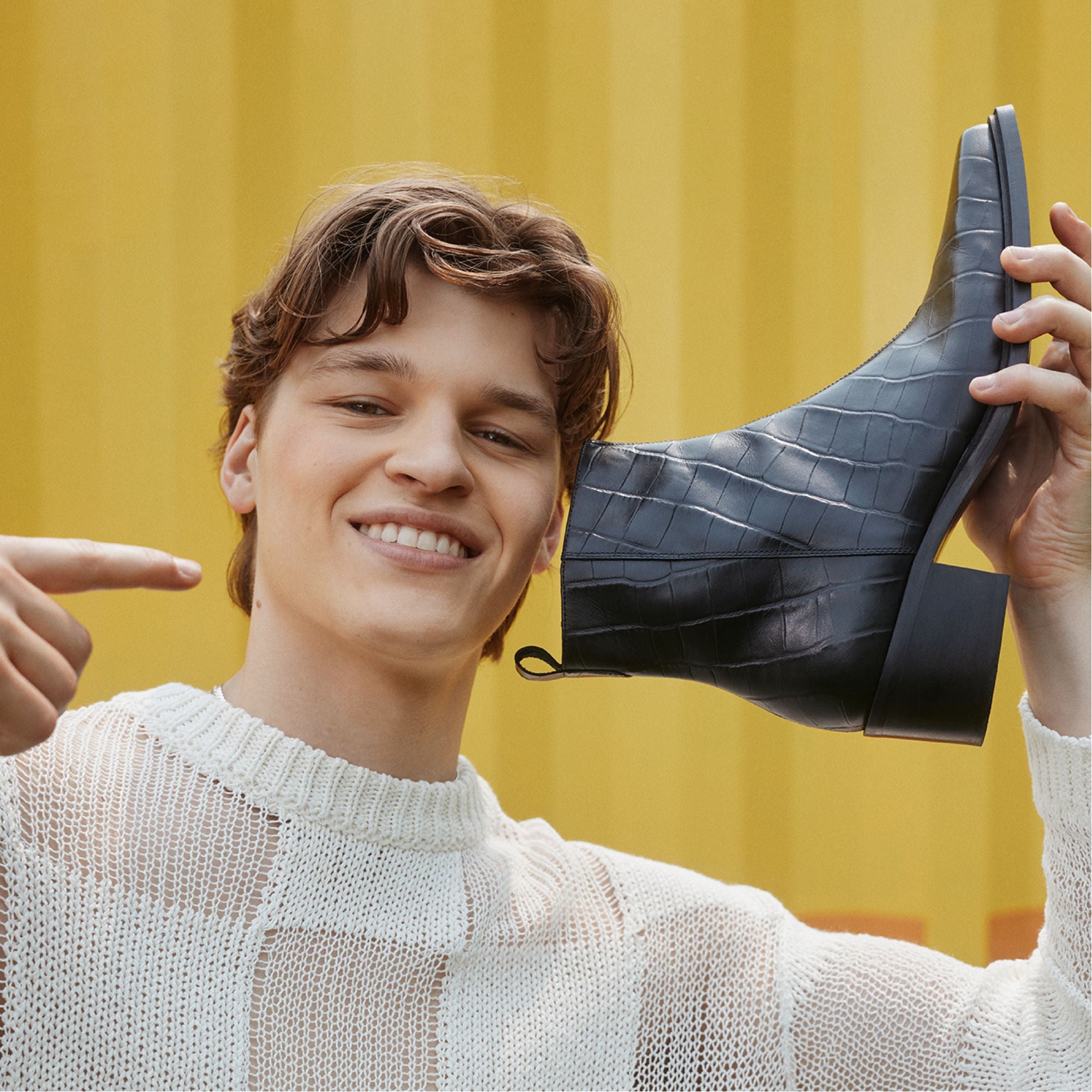 Croc-embossed leather shapes this point-toe ankle boot, a silhouette with a block heel and a discreet elastic panel for easy on and off that travels city blocks with quiet confidence. Pair it with charcoal denim for gig nights, or anchor it with a tailored overcoat for rooftop cocktails.