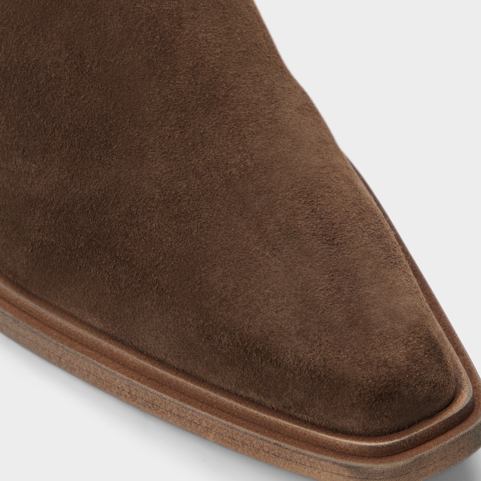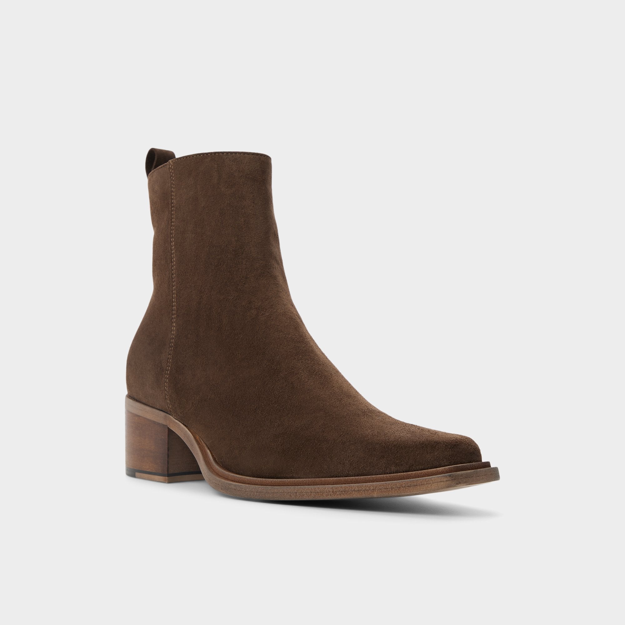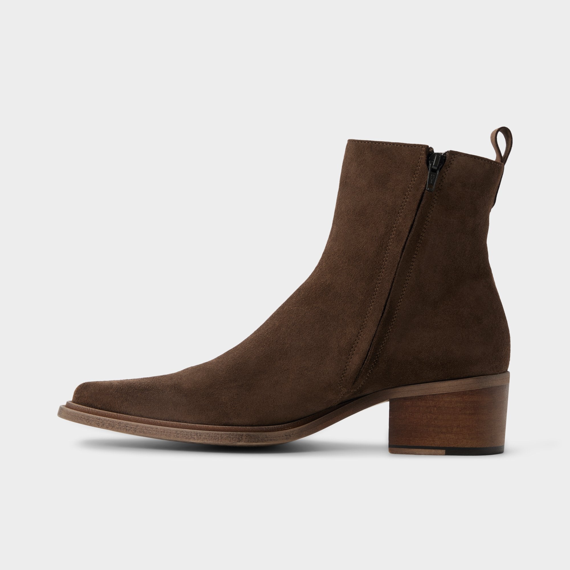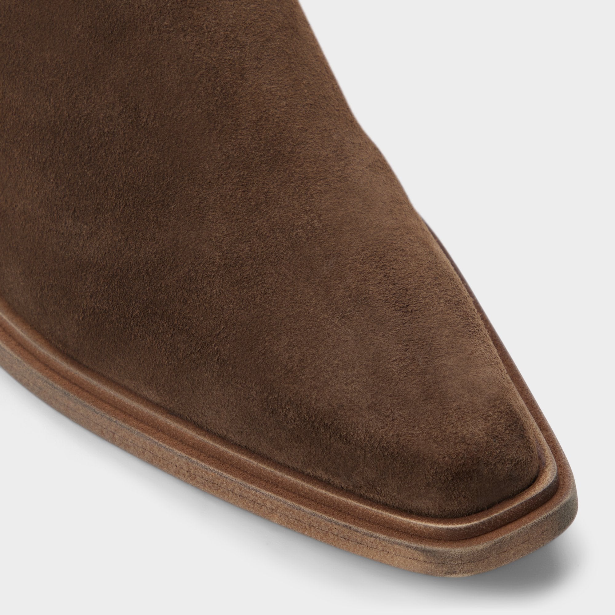 Earthy suede and a sharp point toe define this pull-on ankle boot, exuding rock-tour swagger as a stacked block heel lifts you just enough and a leather outsole smooths every step. Anchor skinny black denim for gig photos, or team tailored wool trousers for winter weddings, letting the suede finish catch the light.