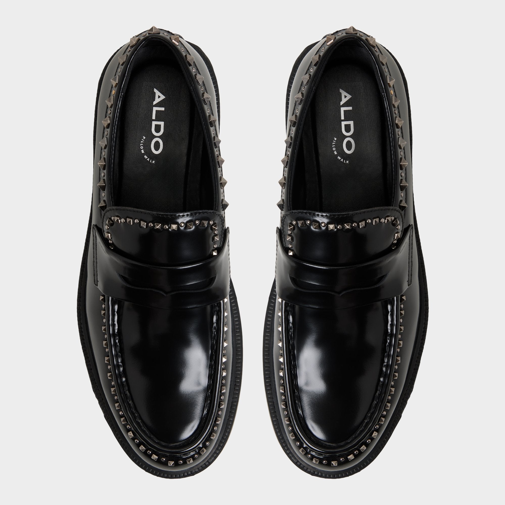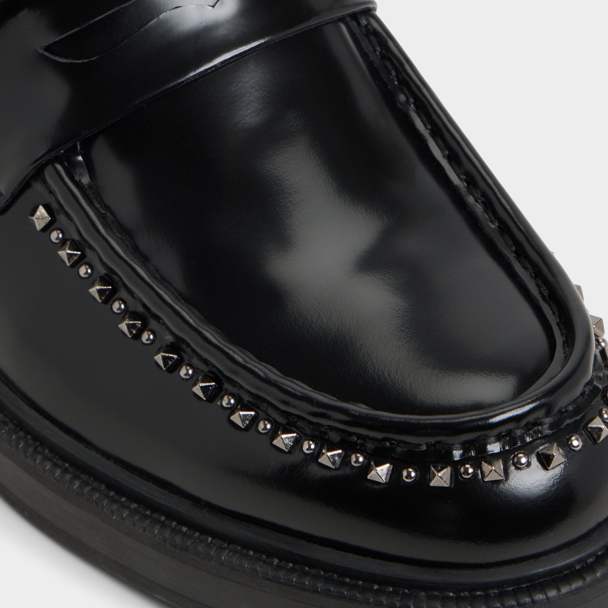 Patent leather gleams with matte studs across the loafer’s silhouette, giving a rebellious edge, while the lug sole anchors each stride on city streets and beyond. Pair it with slim black denim for gallery nights or cropped trousers for after-work drinks, as the studded detail makes the look.