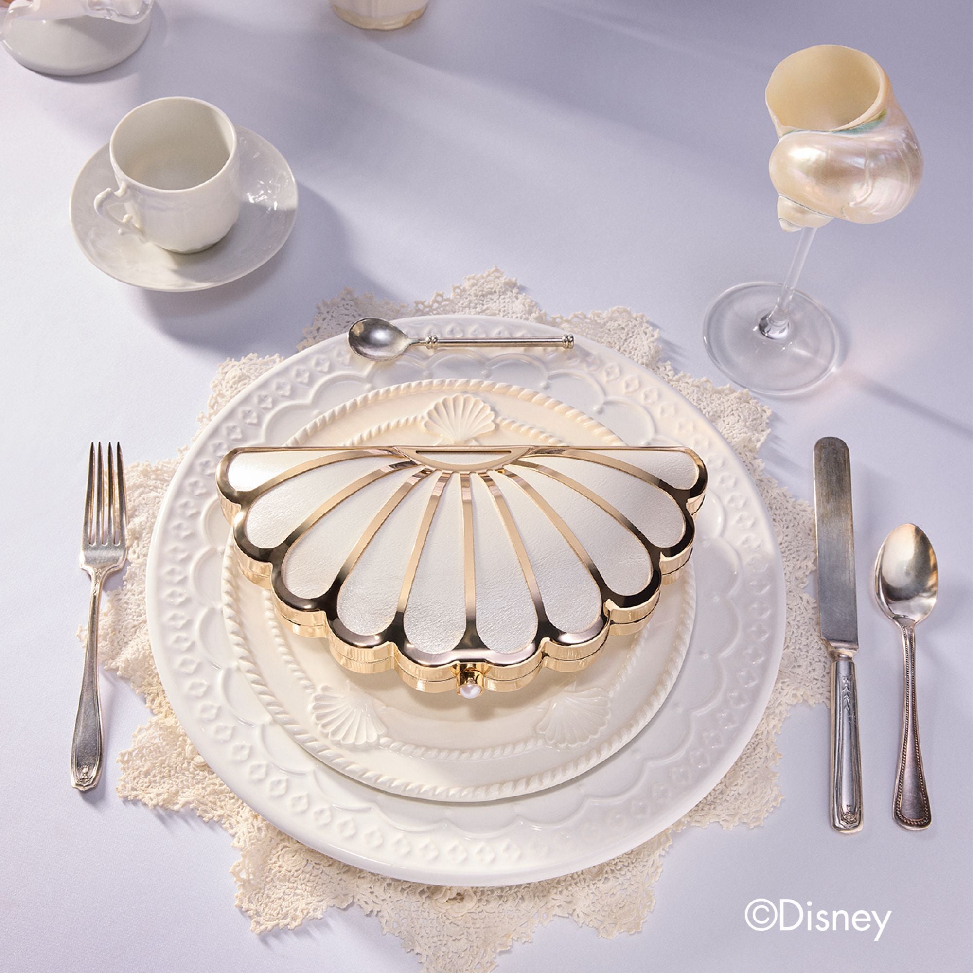 Under the sea and into your arms. This Ariel-inspired white and gold shell-shaped clutch, complete with a pearl clasp is perfect to take strollin’ or dancin’.