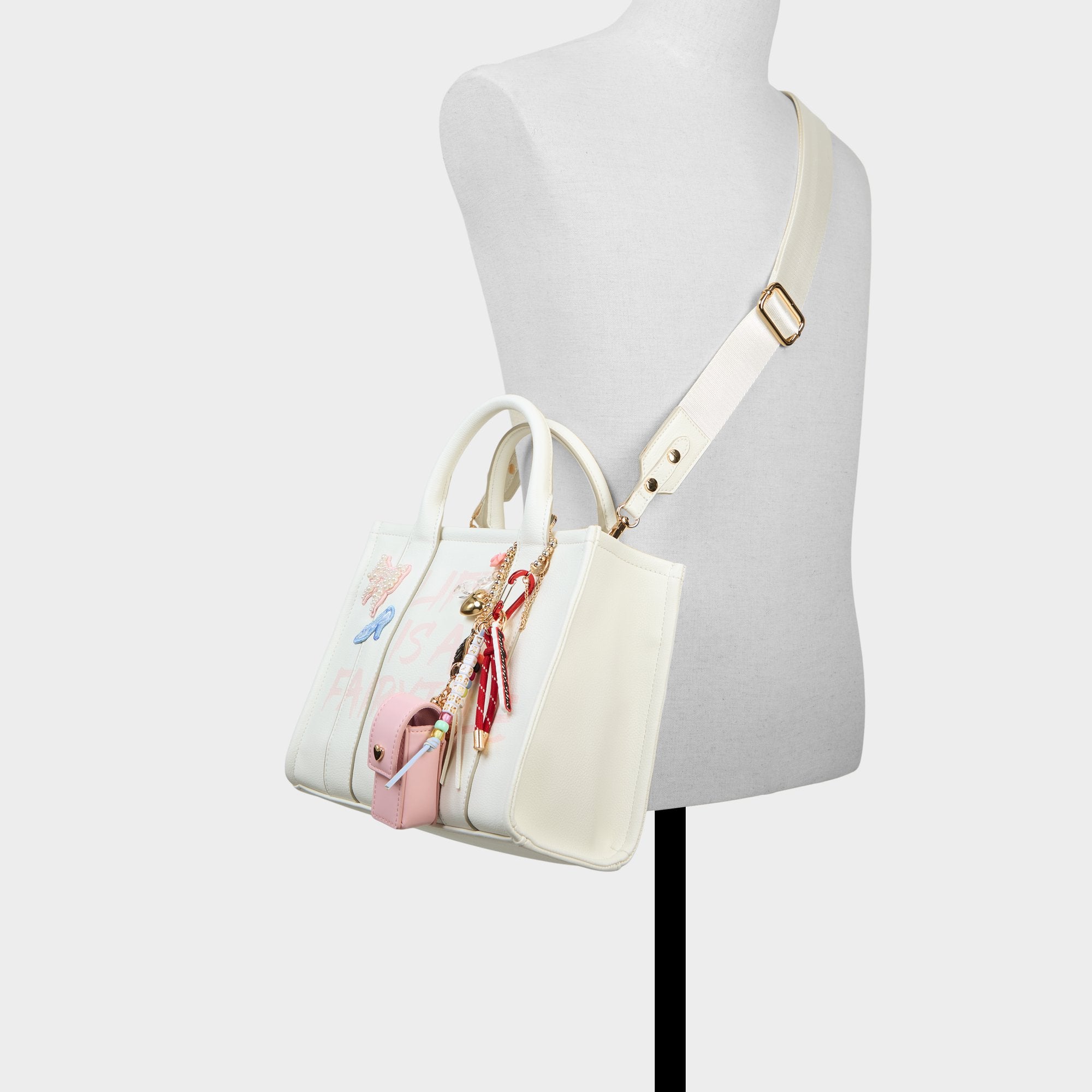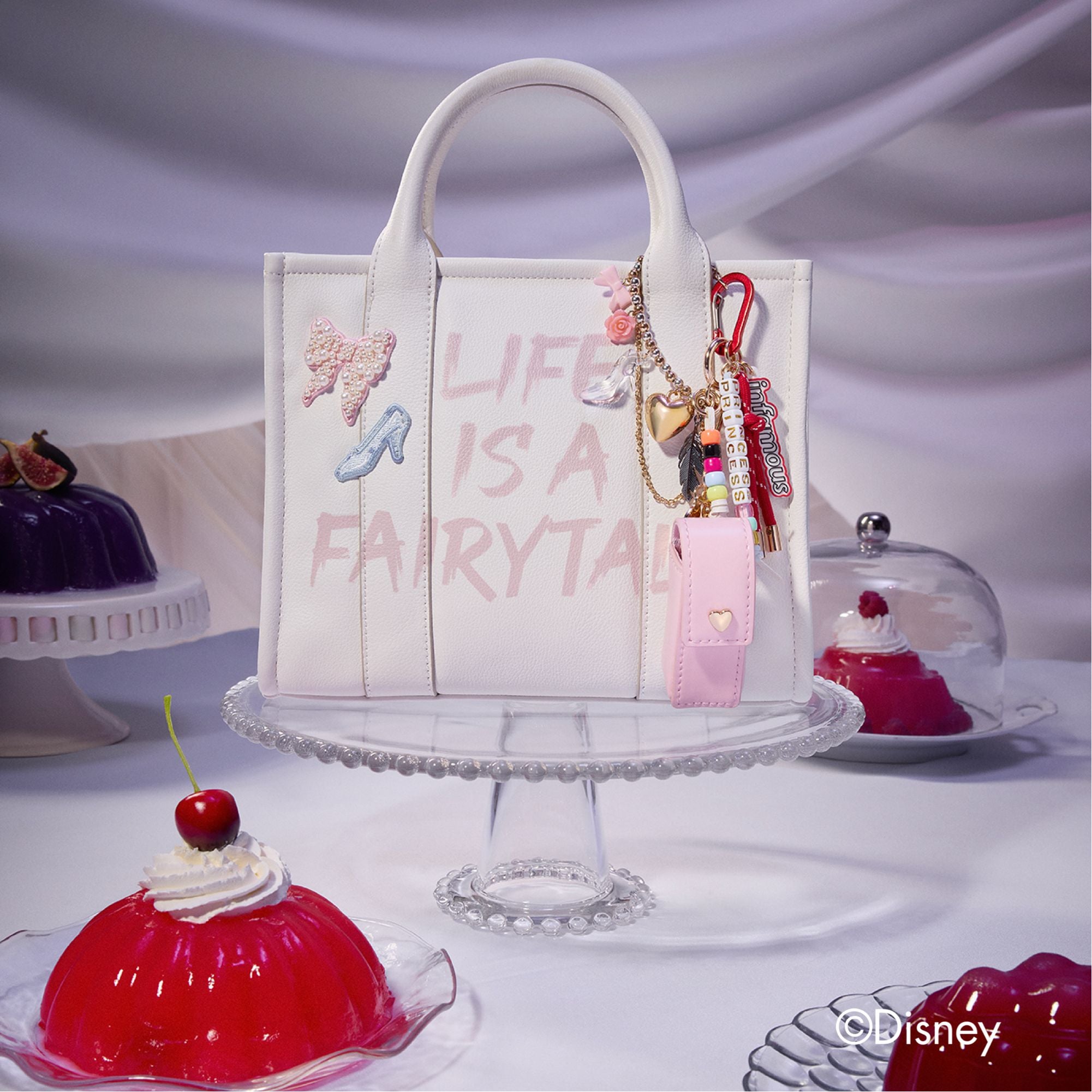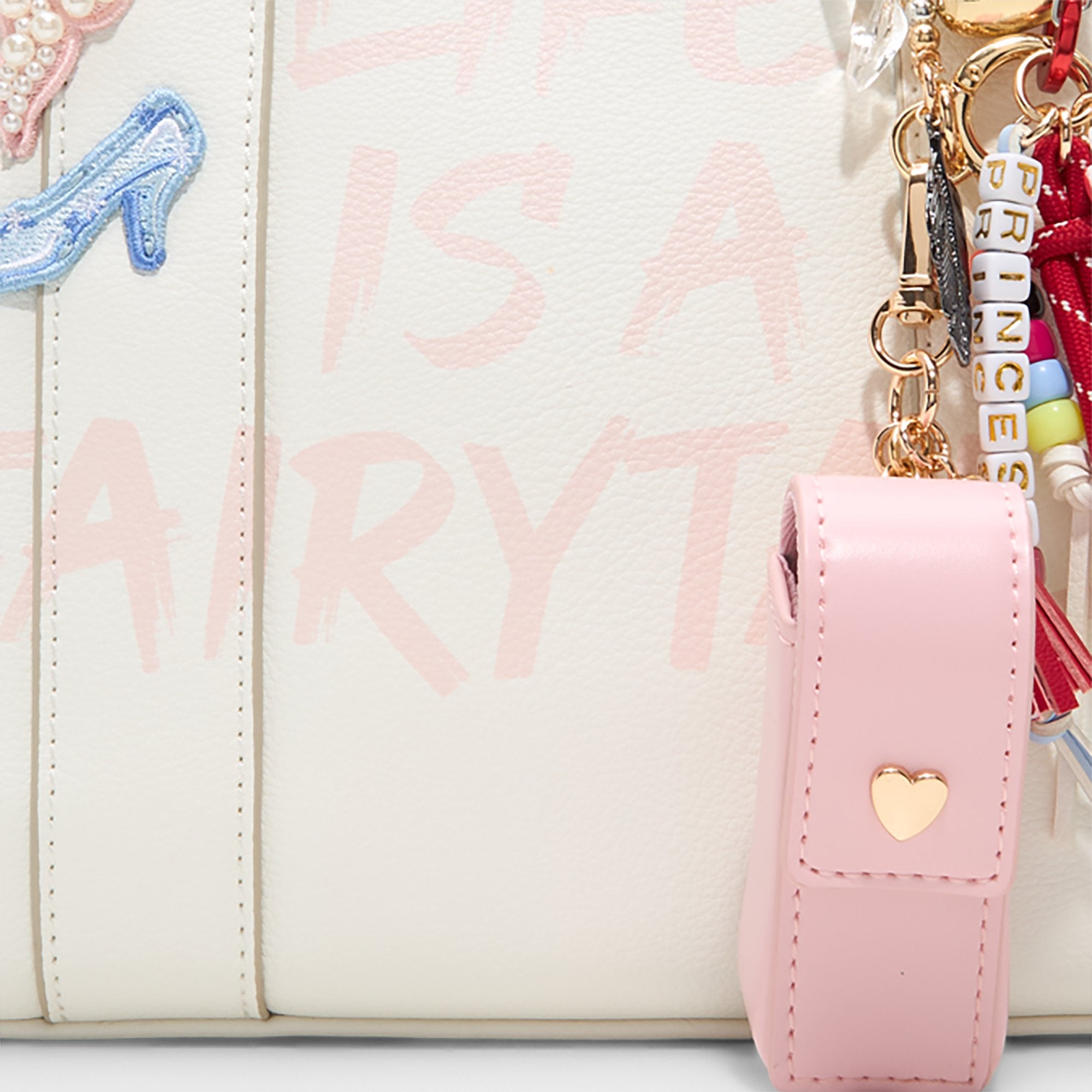 Make a statement. Feminine accents and detachable charms add a whimsical touch to this functional bag, accented with a graphic baby pink signature, “Life is a fairytale”. Wear it day or night and live out your dreams.