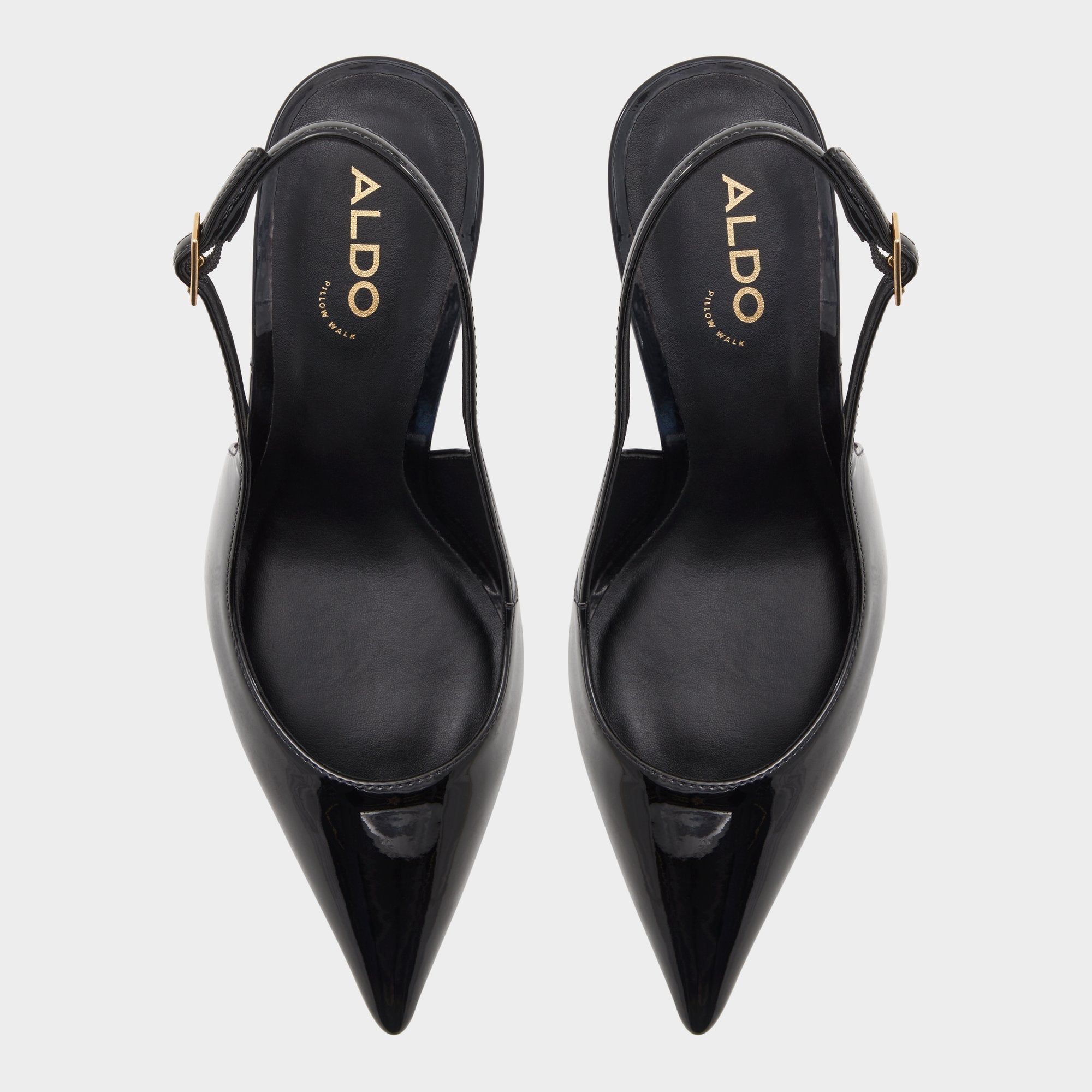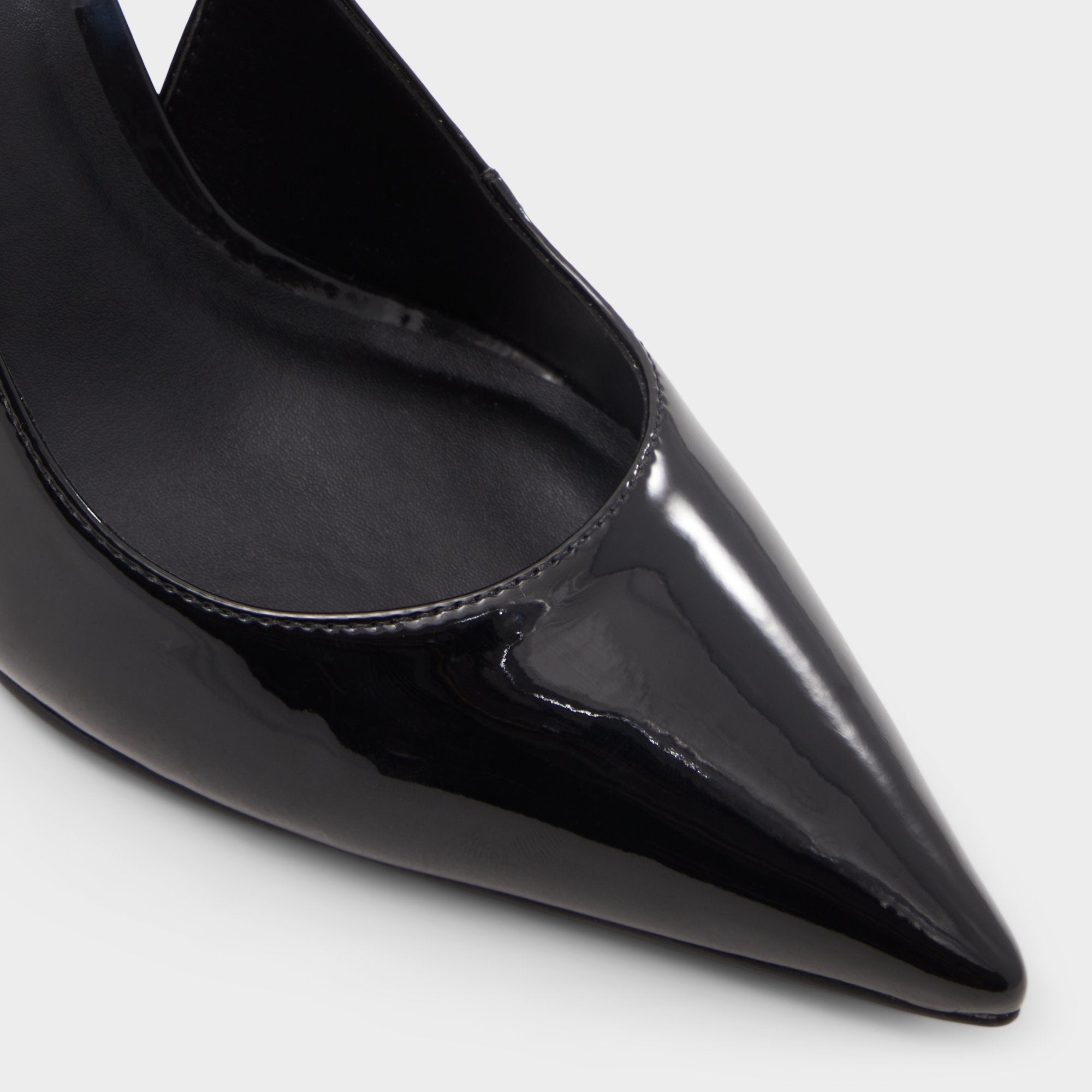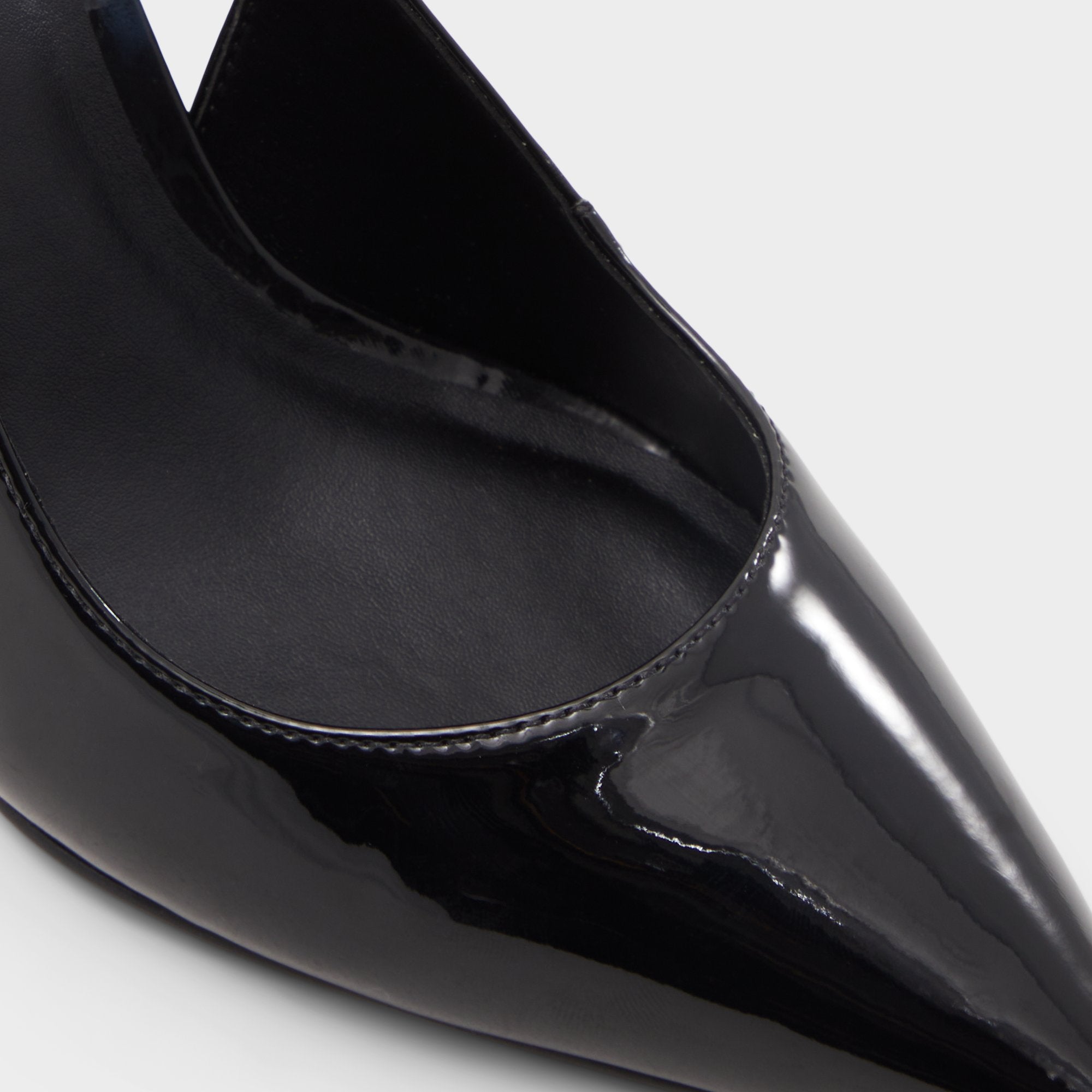Mirror-gloss patent leather sharpens every step with an adjustable slingback that hugs the ankle, while a slim stiletto heel lifts you to just the right height for boardroom doors and midnight lounges. Pair with cropped trousers for power-lunch confidence, or swap in a satin slip when after-dark plans call for unapologetic swish.