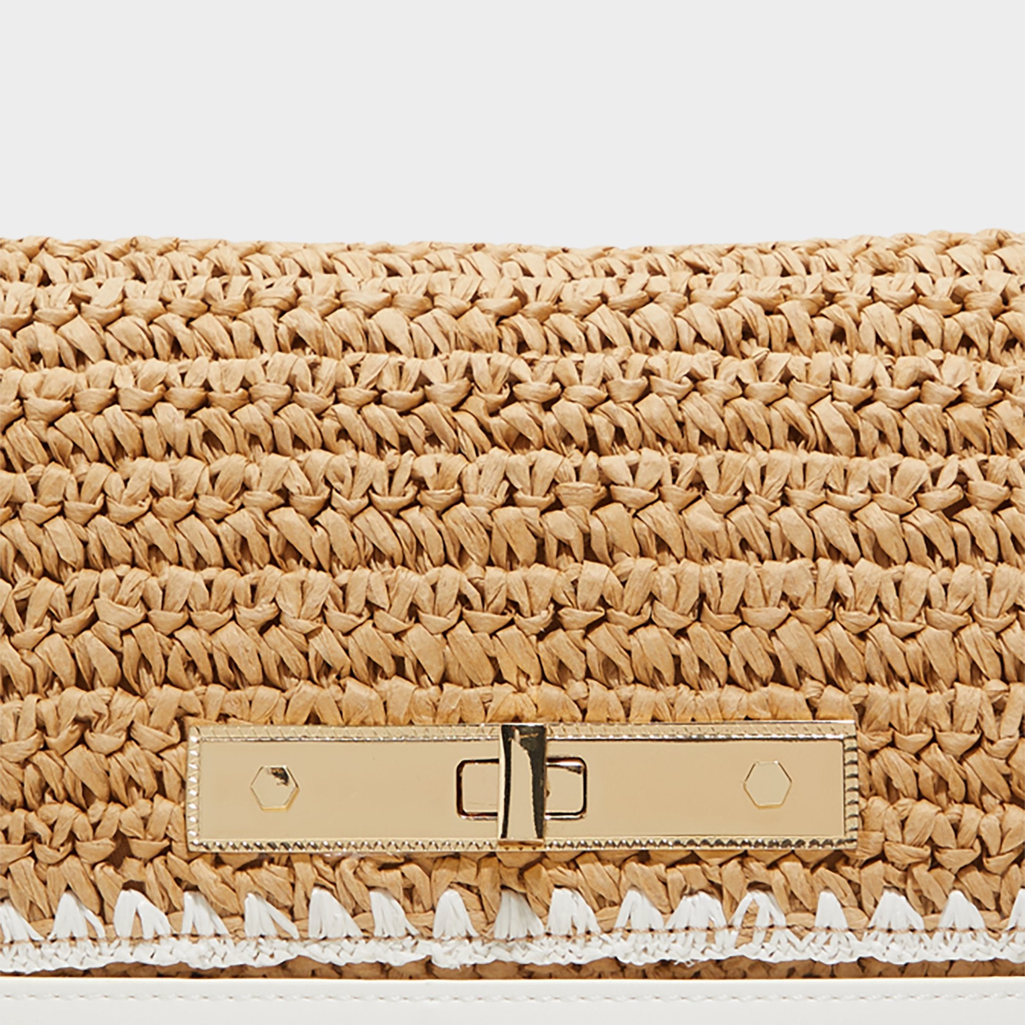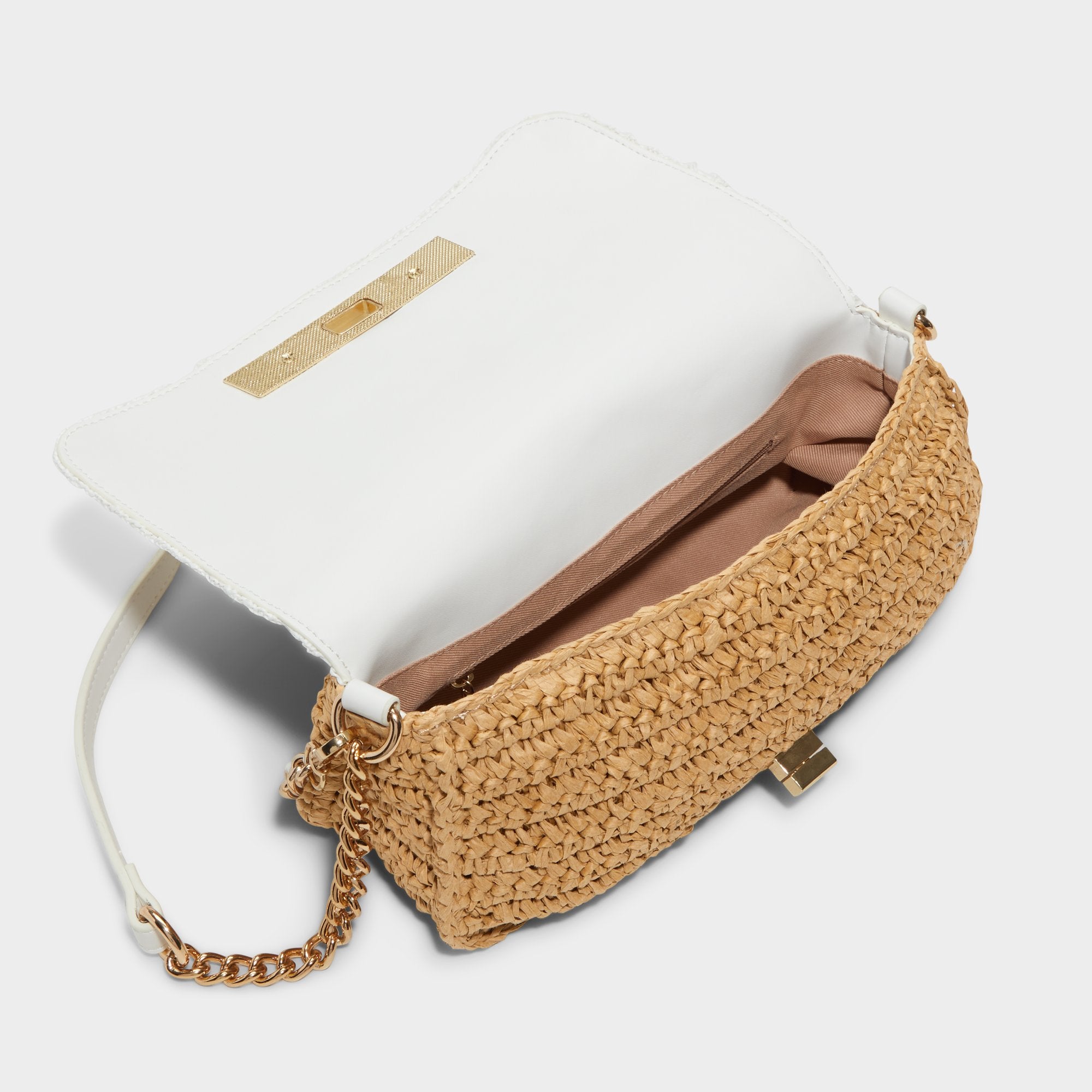 Sun-washed straw shapes an easy baguette, edged in white whipstitch and sealed with a gold turn-lock, while twin straps-braided chain for shoulder moments, slim crossbody for roaming days-swap out quickly. Sling it with a slip dress for patio brunch or tuck it under an oversized blazer for city nights, sealing the look.