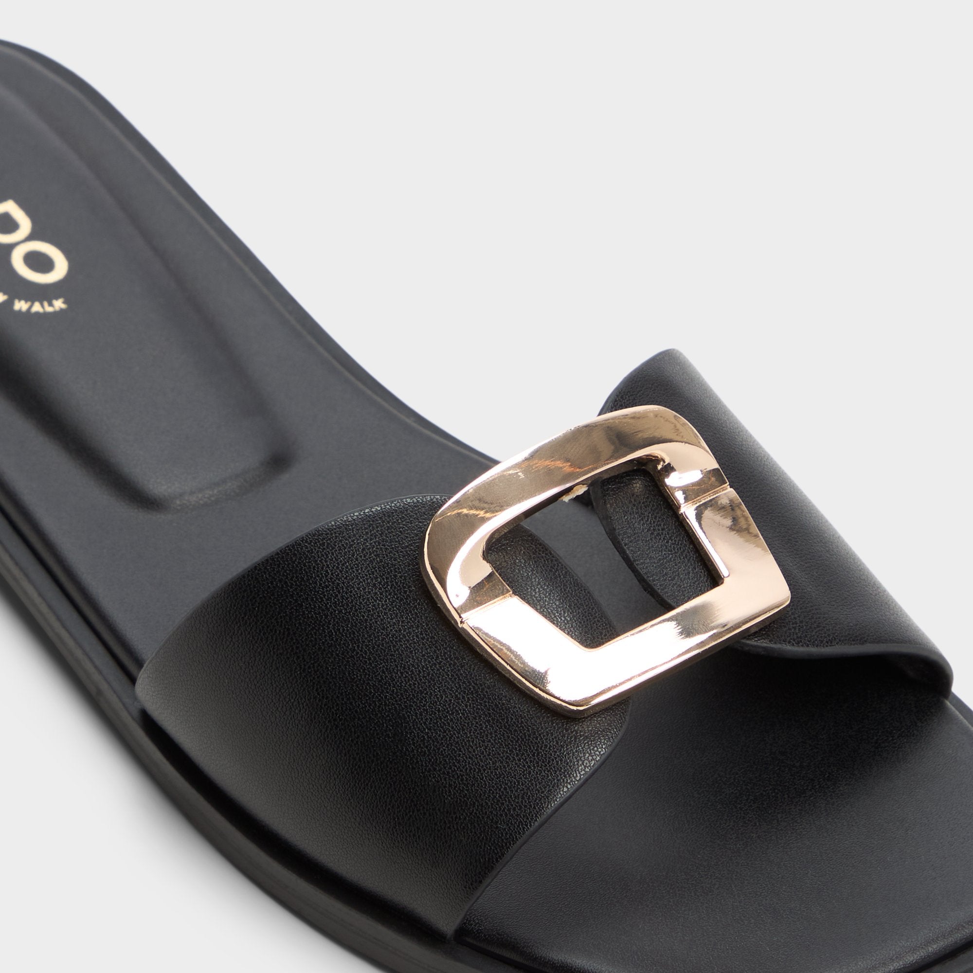 Supple black leather hugs the foot with a clean single strap, a gleaming buckle catching light as a padded square footbed steadies every step from busy elevators to late-night strolls. Pair with cropped linen trousers for brunch, or style it under a sleek slip dress for rooftop cocktails.